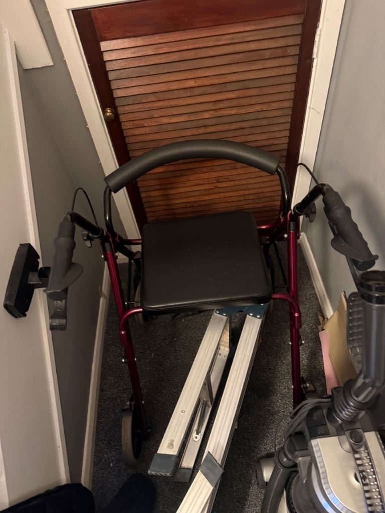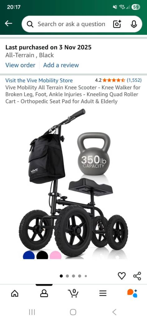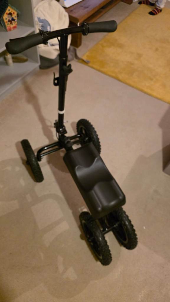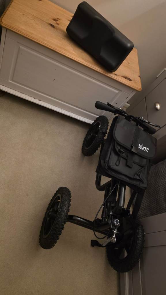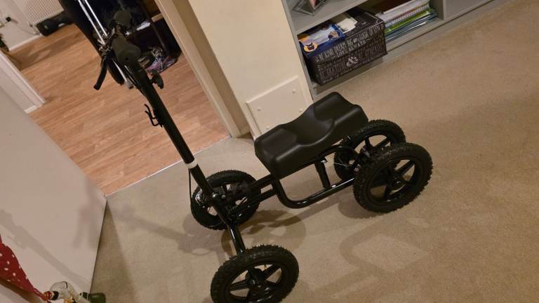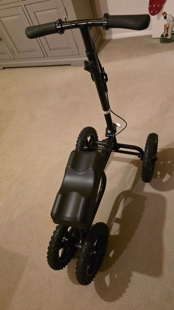 Selling, as my wife's ruptured achilles tendon is healing and she no longer has use for it... A god send whilst she needed it. Hardly used and in perfect condition The Vive Mobility Knee Scooter ir All-Terrain Black is a durable and versatile mobility device suitable for adults. Made from stainless stee and weighina 25 ka, this knee scooter is desianed for all terrains with a maximum load capacity of 300 lbs. It features elevating legrests and a foldable design for easy storage and transport. The CE marked unit has four wheels for stabilitv and is ideal for individuals looking for a reliable and comfortable mobility solution. Made in China, this knee scooter is a practical and stylish option for those needinc assistance with their mobility.