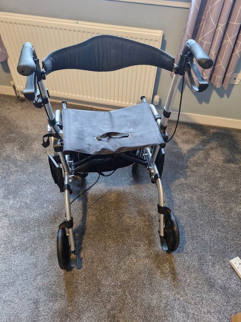 Folding walking aid with seat, back can go either way and can be used to wheel person as has removable feet rests. Also has bag attached. Cost £125 when new