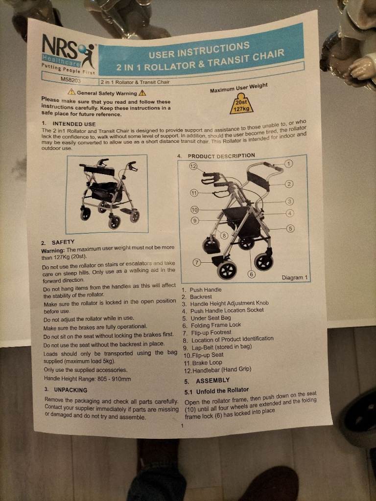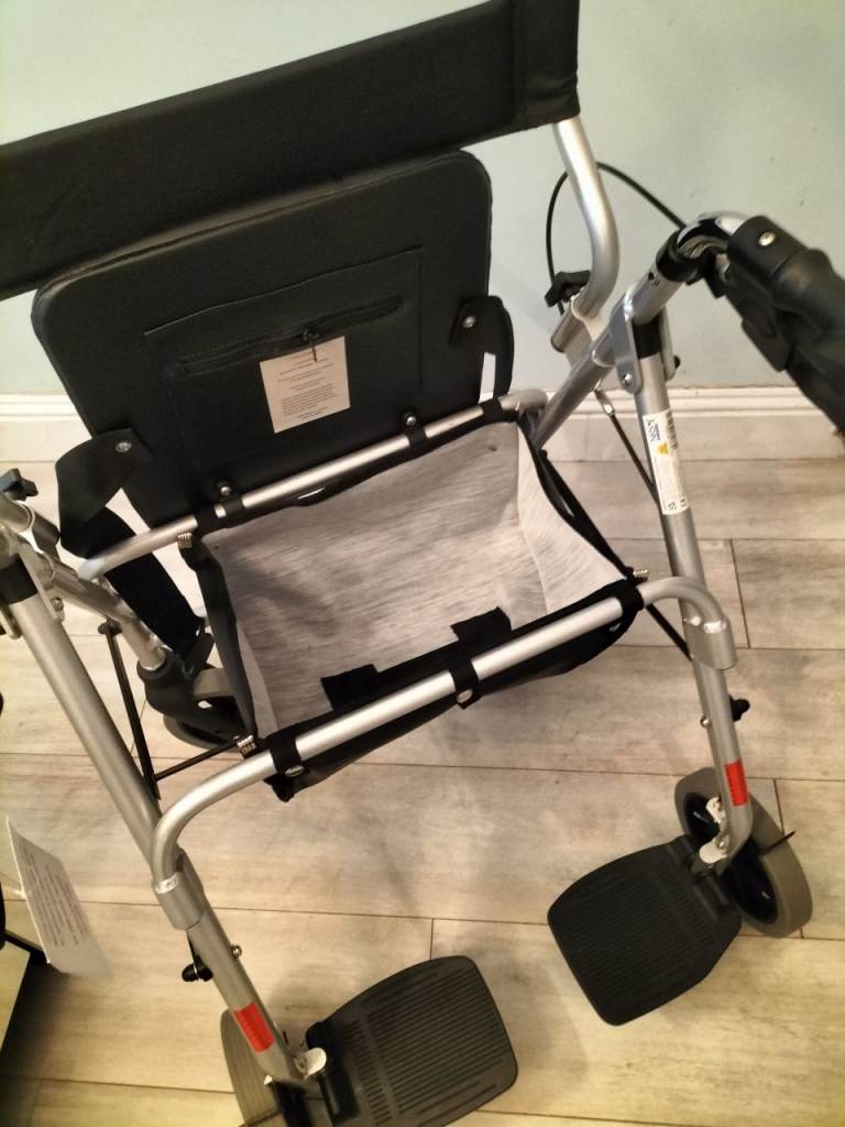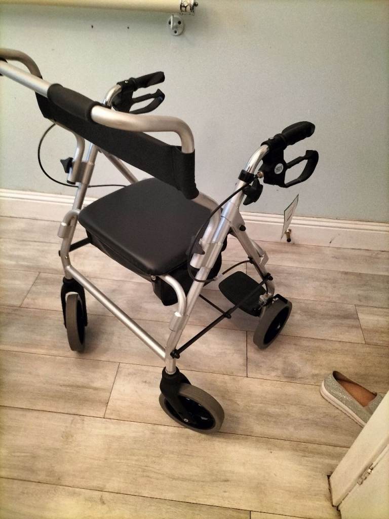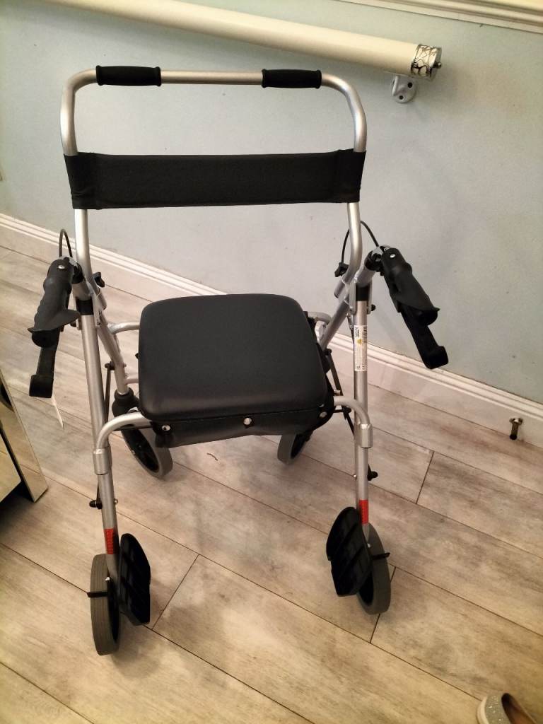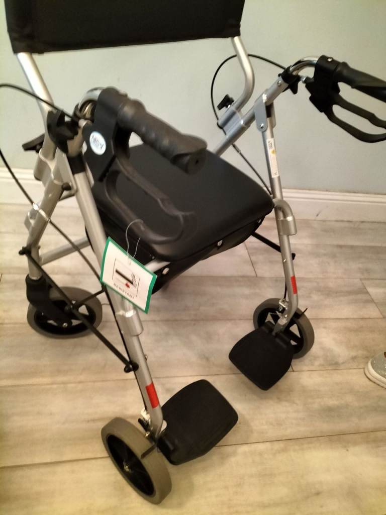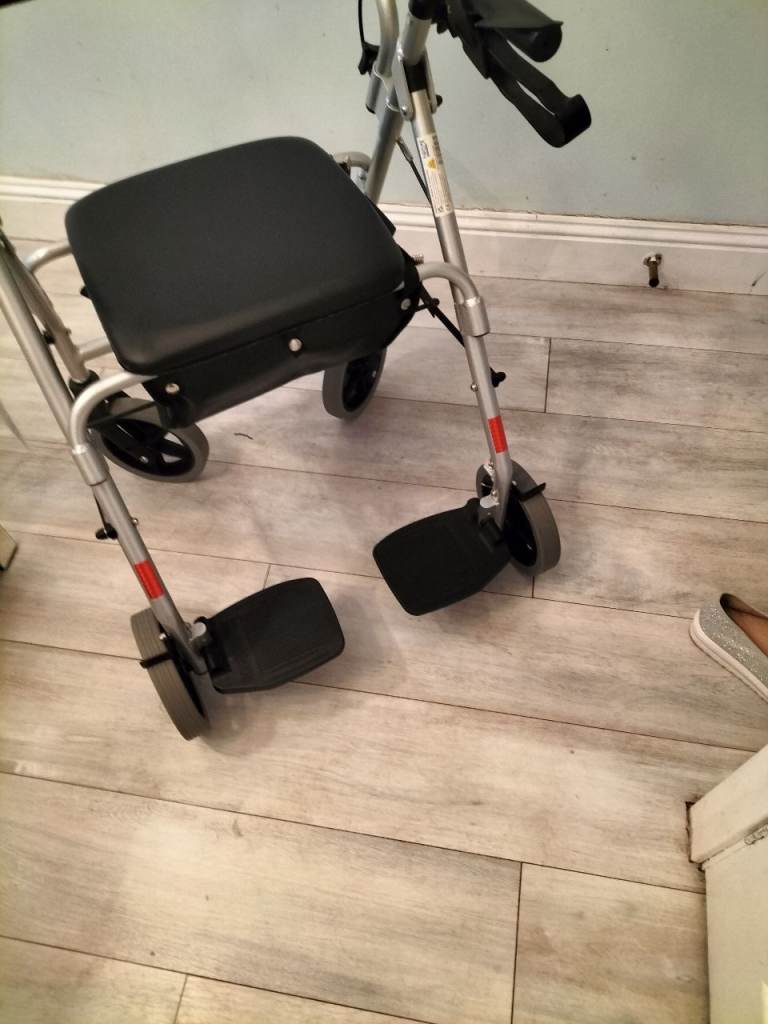 Quality walking frame as new, still has tags. This walker is finished in a silver colour and has twin brakes, a solid seat which hinges open to reveal a storage bag below. This item also benefits from a set of feet rests which enable it to be used as transport chair or occassional wheelchair. Folds for easy storage. Only used once and in as new condition. £65 ono