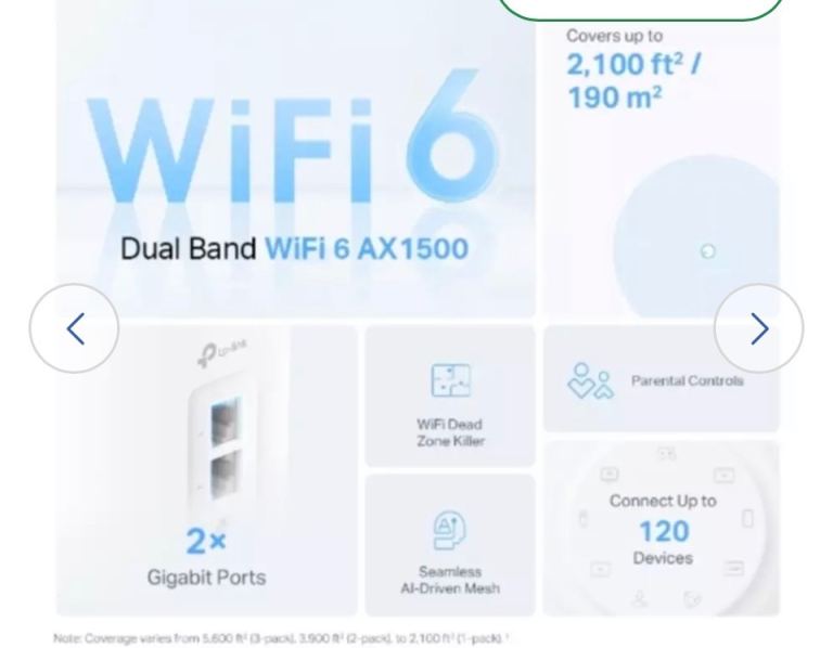 Mesh Network Powered by Wi-Fi 6 Product summary: Faster Connections: Wi-Fi 6 speeds up to 1,500 Mbps - 1,201 Mbps on 5 GHz and 300 Mbps on 2.4 GHz. Connect More Devices: OFDMA and MU-MIMO technology quadruple capacity to enable simultaneous transmission to more devices.