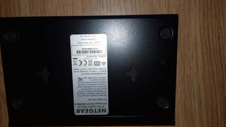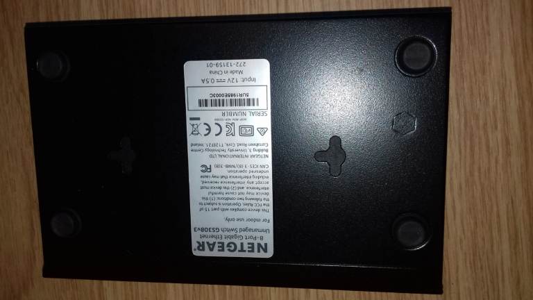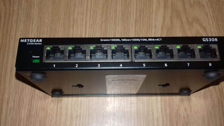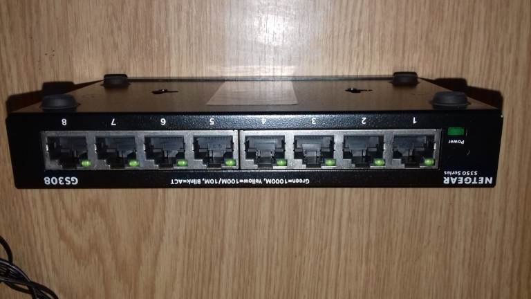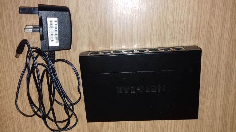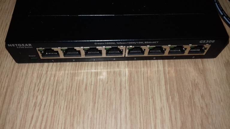 Netgear 8 Port 10/100/1000Mbps Switch model GS308V2 in perfect condition. No damage, new condition. Complete with original power supply. Metal case, wall mountable.