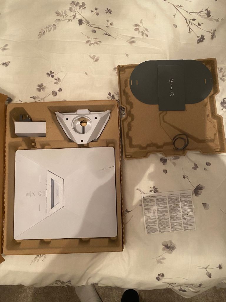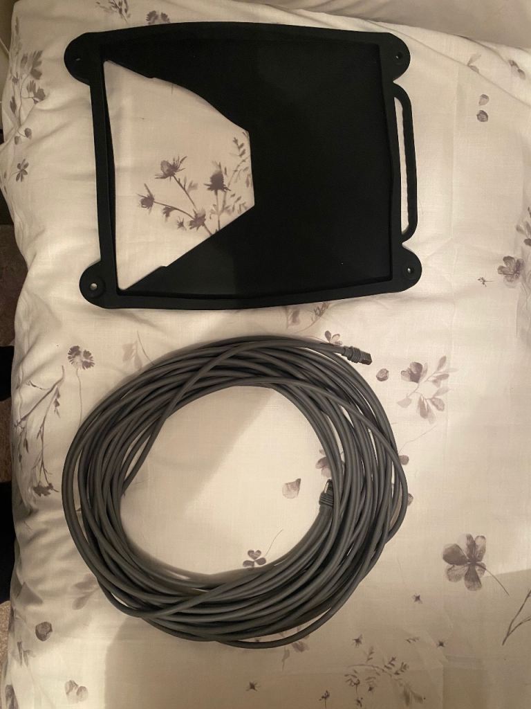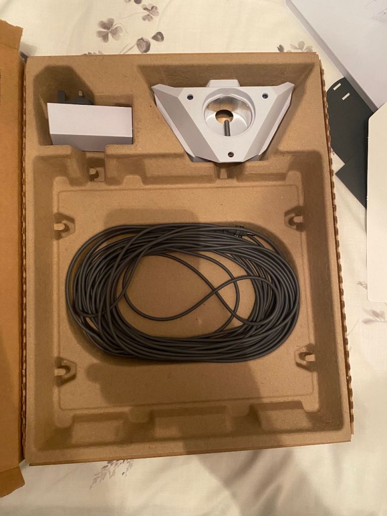 Comes with original box, UK plug and power cable, mount adapter, an ethernet 25m cable, an Amazon rubber case mount with 4x suckers that easily sticks to windows etc. and A car power cable that powers that Starlink from a USB-C port for on-the-move use.