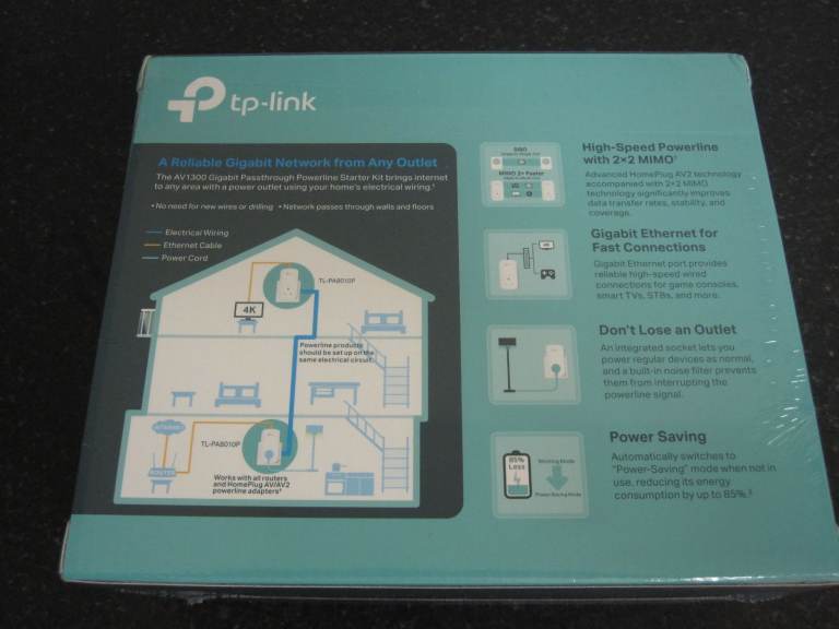 Extend your home internet connection through the walls with this adapter kit. Takes minutes to set up with no configuration required, simply plug one base adapter into the power socket near to your modem/router - connect those two devices together using the Ethernet cable - plug the second adapter into the socket near to your television/set top box/games console/laptop/desktop PC etc - connect these devices to the second adapter using the Ethernet cable. With a 1300 Mbps you can stream 4K, game online, download large files without any issues. The adapters automatically enter power-saving mode when not used which can save up to 85% energy compared to always-on powerline adapters. A pass-through socket ensures that no power outlet goes to waste, so perfect for connecting wired devices. Works with all UK broadband providers, includes 2 Ethernet cables and full instructions, cost £70, brand new in sealed box.