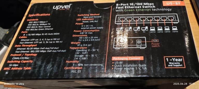 Upvel 8 Port mini Switch for sharing network or router connection. It's brand new in the box. I bought it but found out it was wall mount rather than surface ( although it could be used that way if you really wanted to). Also it has an EU plug so will need a travel adapter hence the price