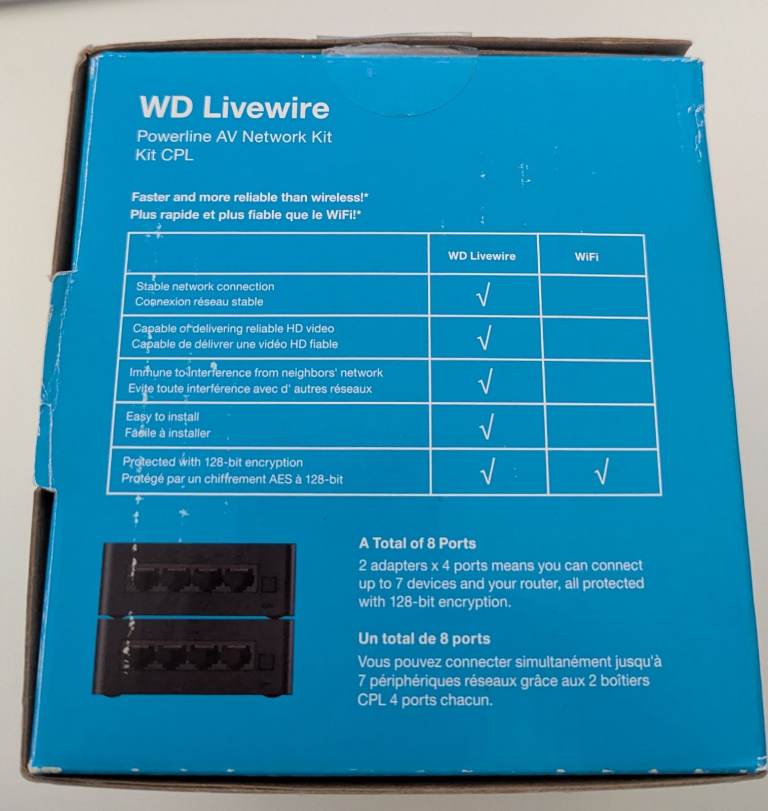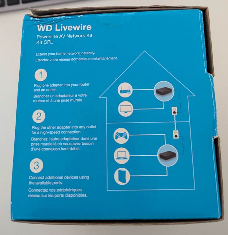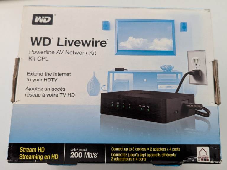 WD Livewire Powerline AV kit for extending your home network through your electrical wiring. NOT a WiFi extender, only Ethernet cable.