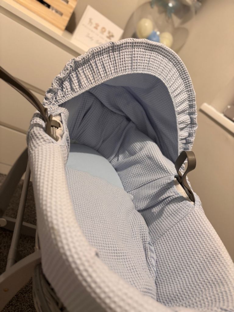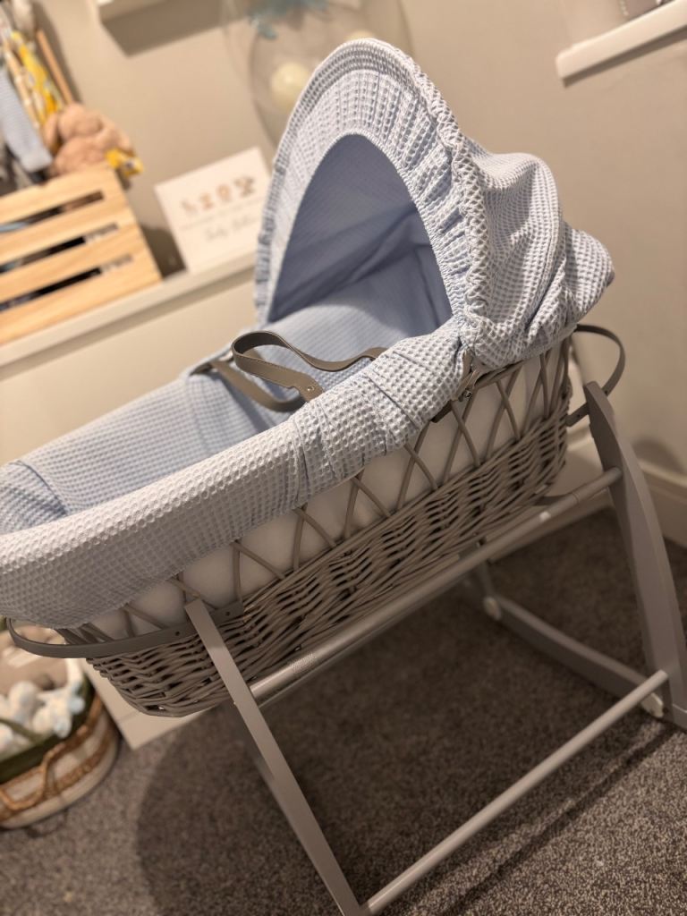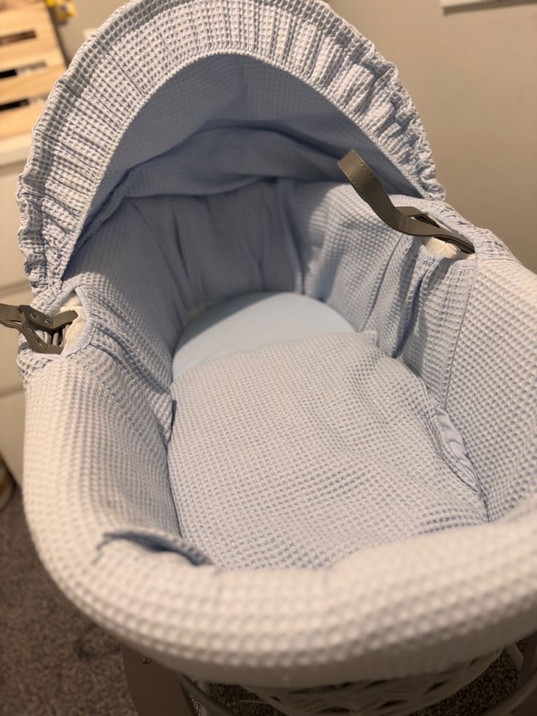 Blue waffle moses basket. Used once baby slept in for a nap not used since as didn’t like it.