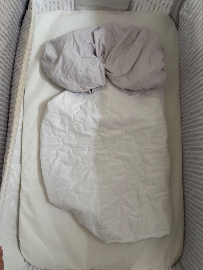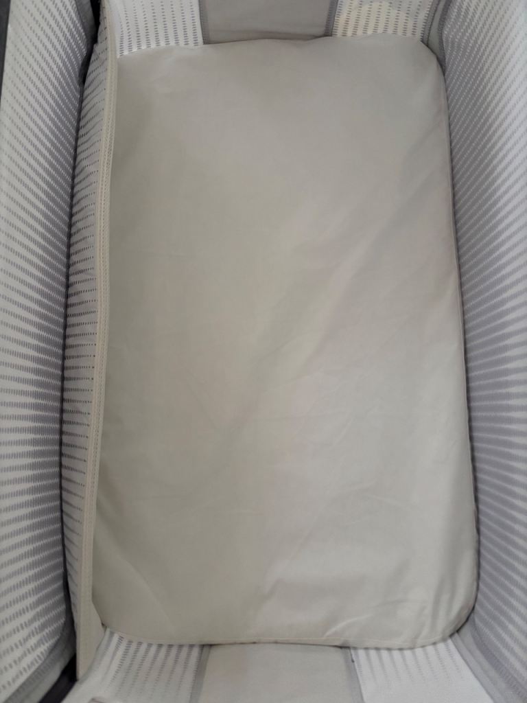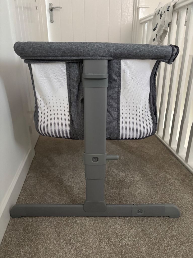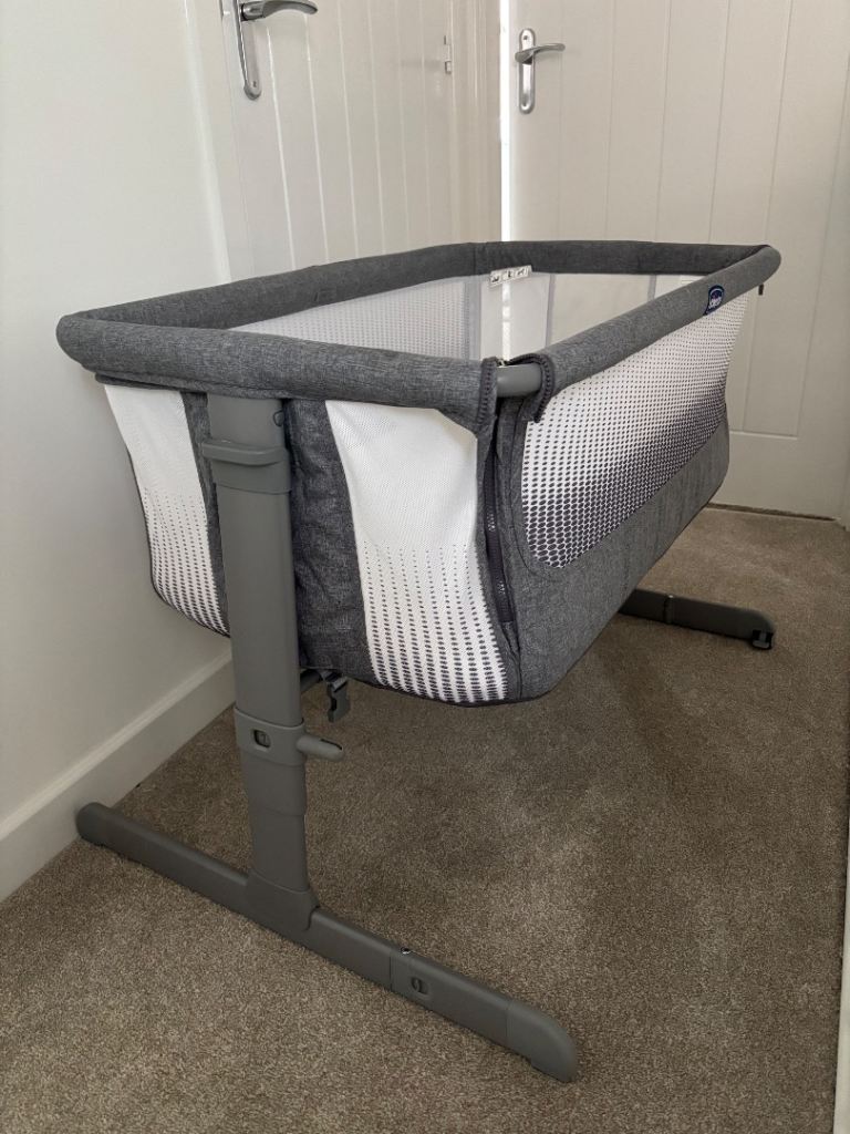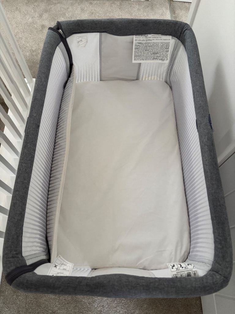 Chicco next to me bedside crib- with mattress, waterproof mattress cover, and two light grey sheets. All original pieces present and with manual, bed straps, and carry/travel bag.