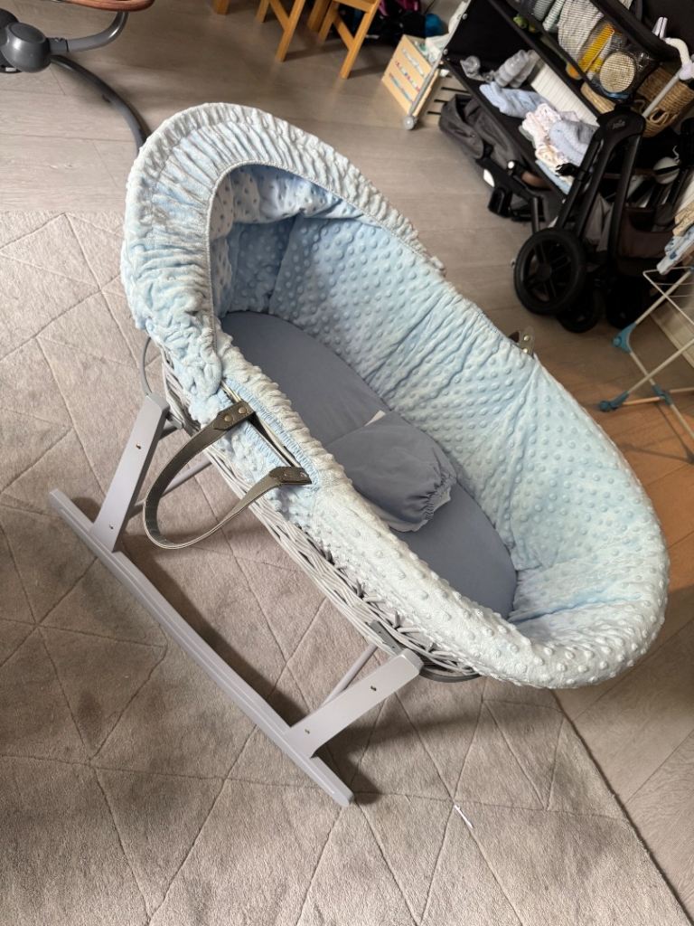 Moses basket with grey stand, blue coverings and mattress. In brilliant condition. £70 brand new.
