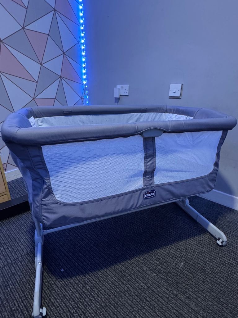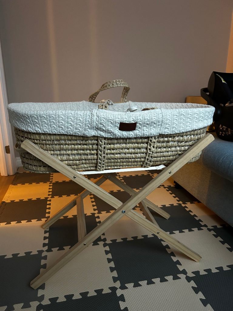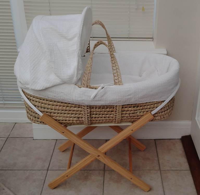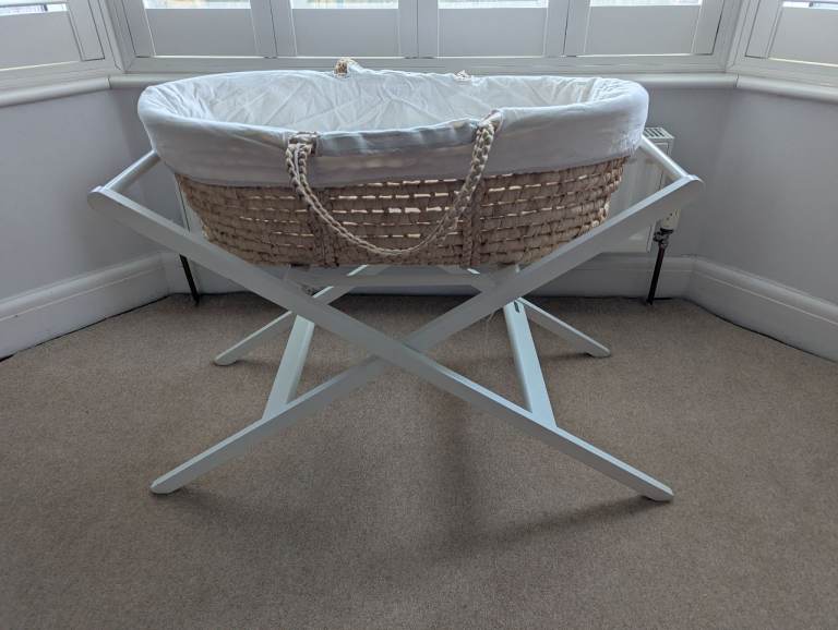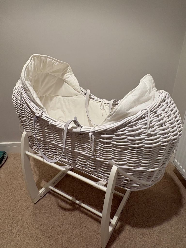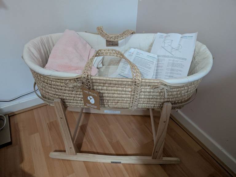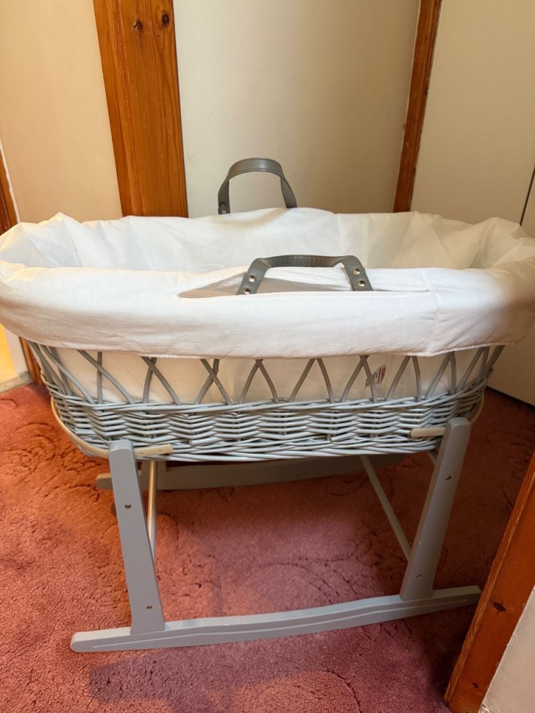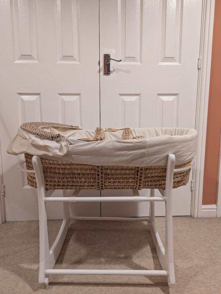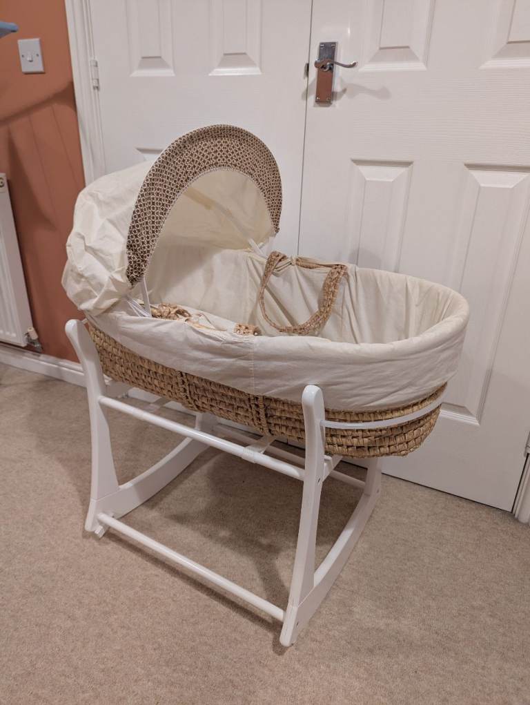 Moses basket with rocking stand. Comes with mattress and linen. Barely used. Smoke and pet free home. Collection only.
