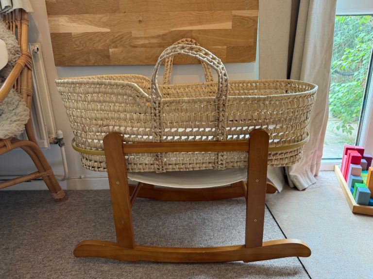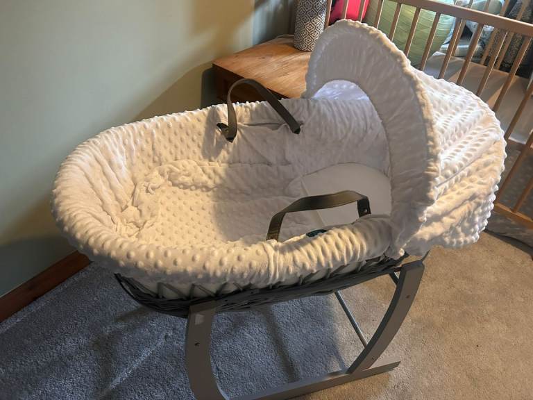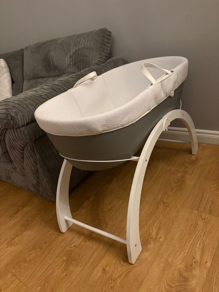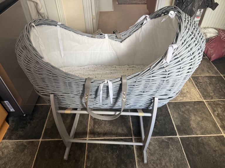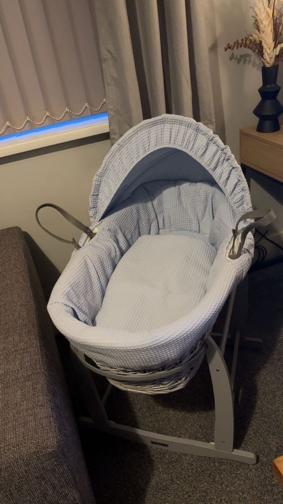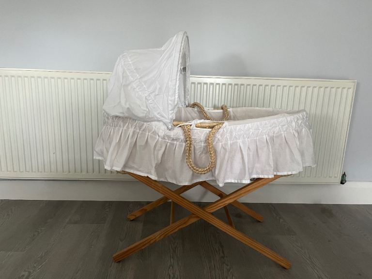 Lovely Moses basket with stand, 3 set of sheets and cover to make it extra cosy. In great condition except for the left side handle as seen on picture.