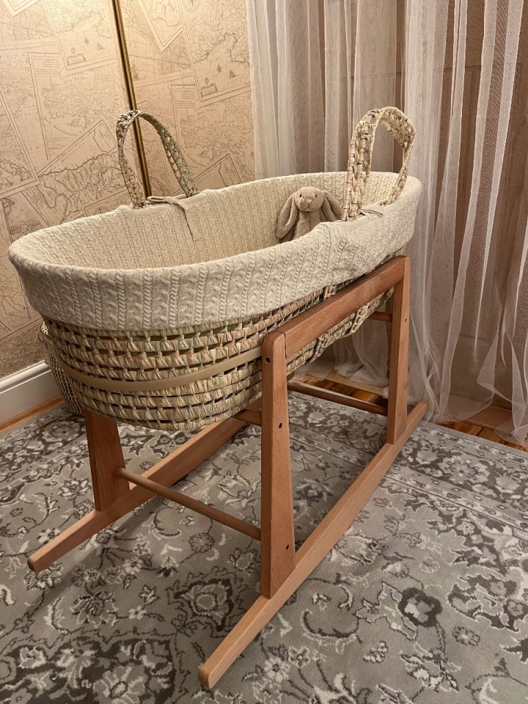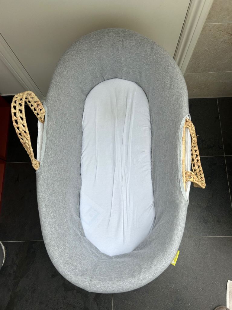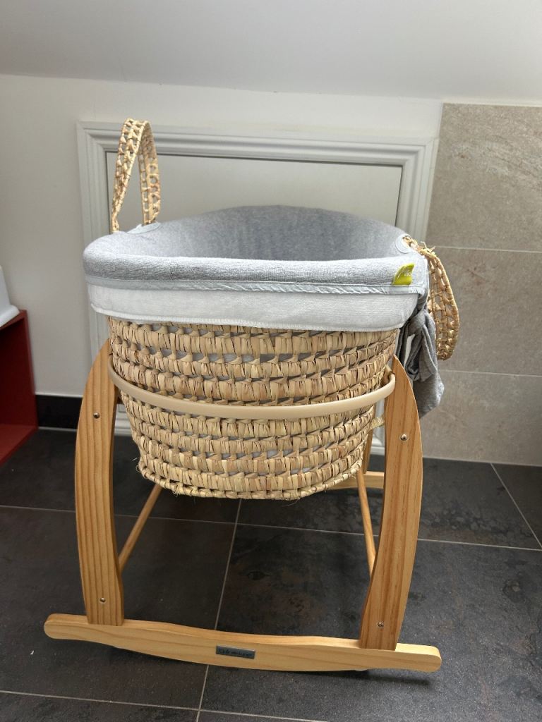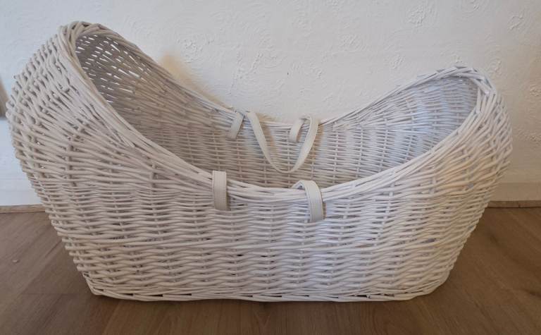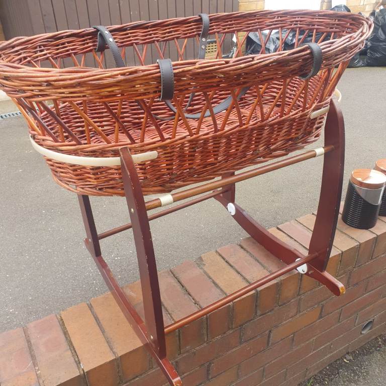 Lovely Moses basket with stand, 3 set of sheets and cover to make it extra cosy. In great condition except for the left side handle as seen on picture.