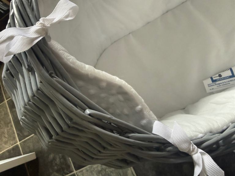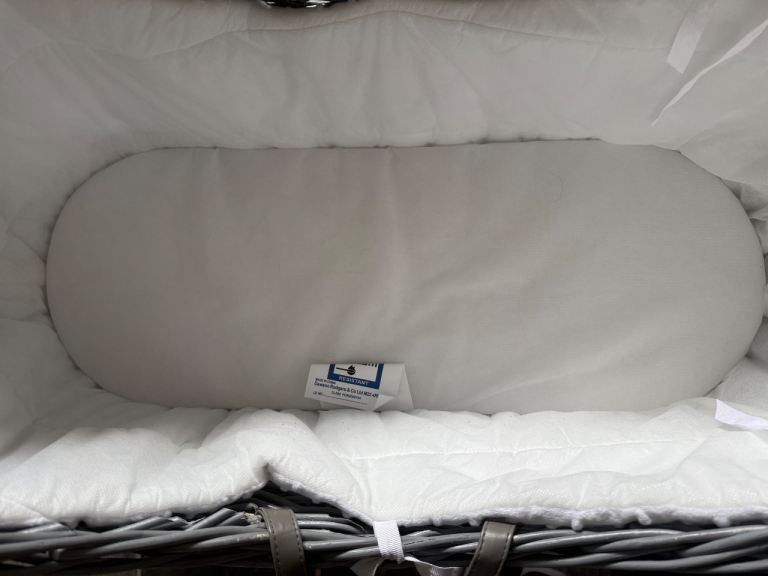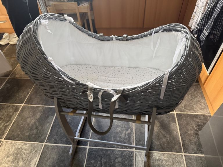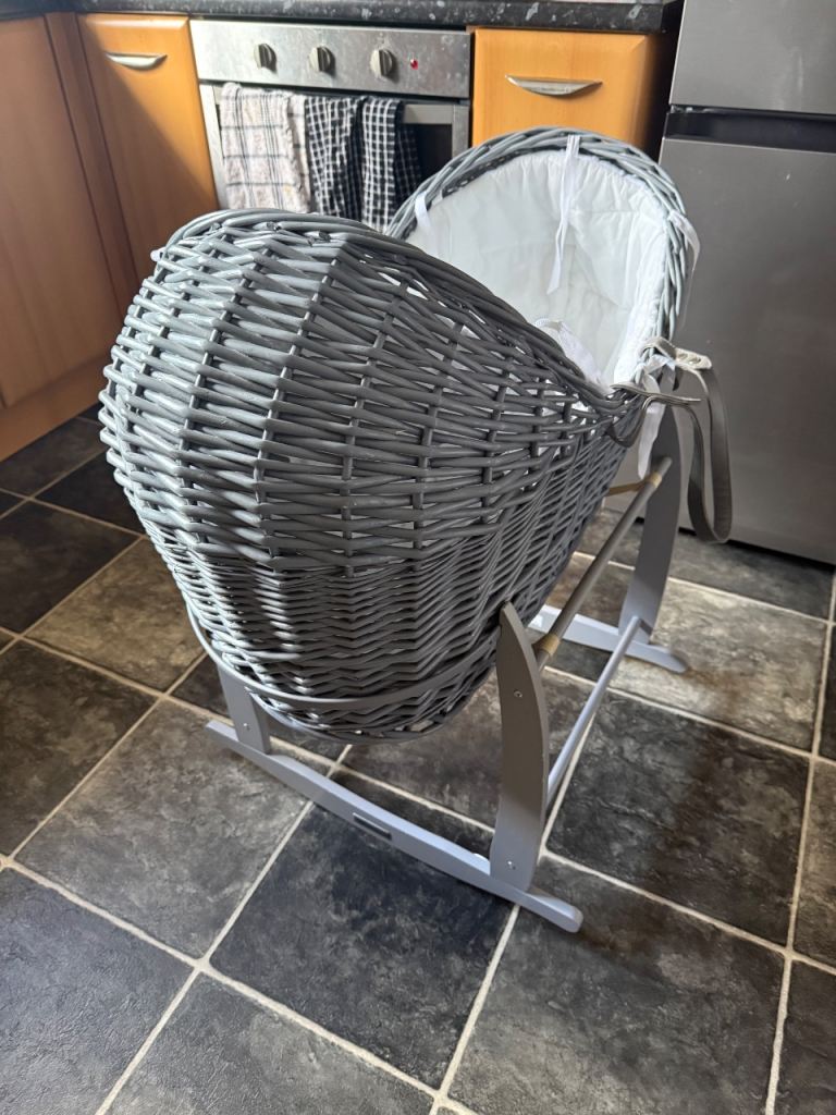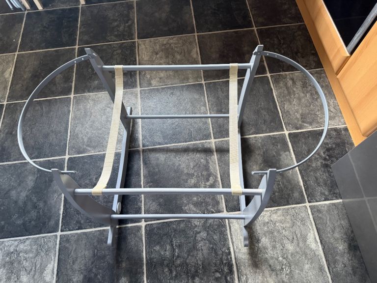Grey Noah pod, great for longer babies. Comes with a brand new mattress, was never used. Liner included with stand that rocks.