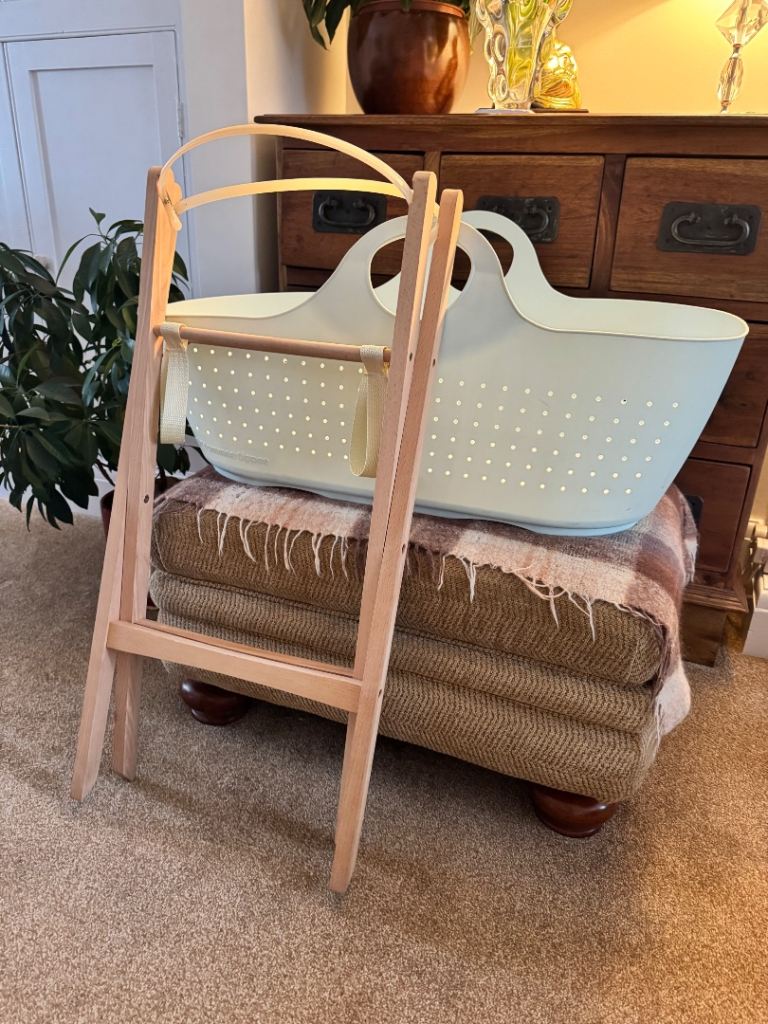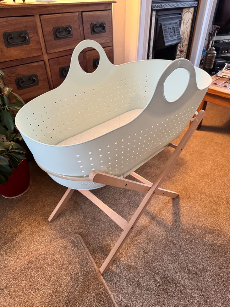 Basket is second hand but no signs of use and mattress is new. Original basket would have come with a plastic stand but I’m selling with a wooden stand which fits perfectly, plus a fitted mattress.