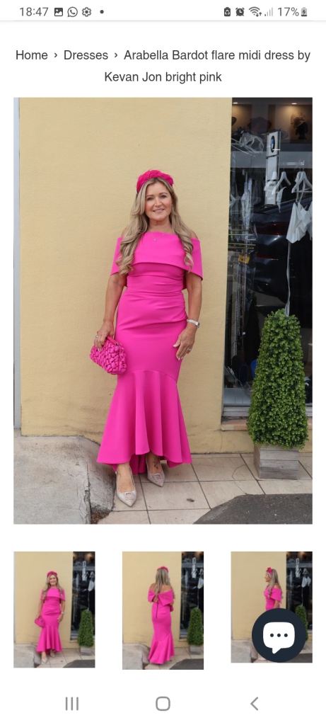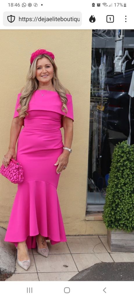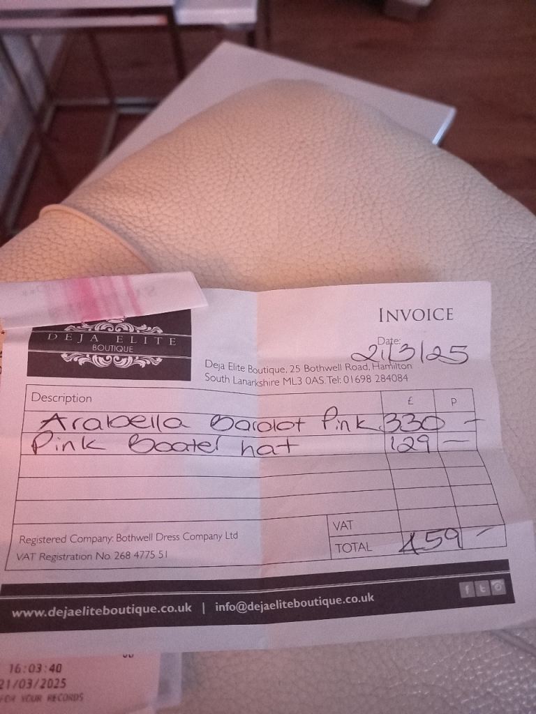 Fits size 14 comfortably. Pink designer dress by Kevan John, purchased from Deja Elite Boutique in Hamilton March 2025. Worn once and dry cleaned ready to wear. Hatinator made by Bees Milliners. Dress and hat purchased for £459 as receipt above shows. Bargain price drop £150!! Must try on and uplift from Ashgill ML9