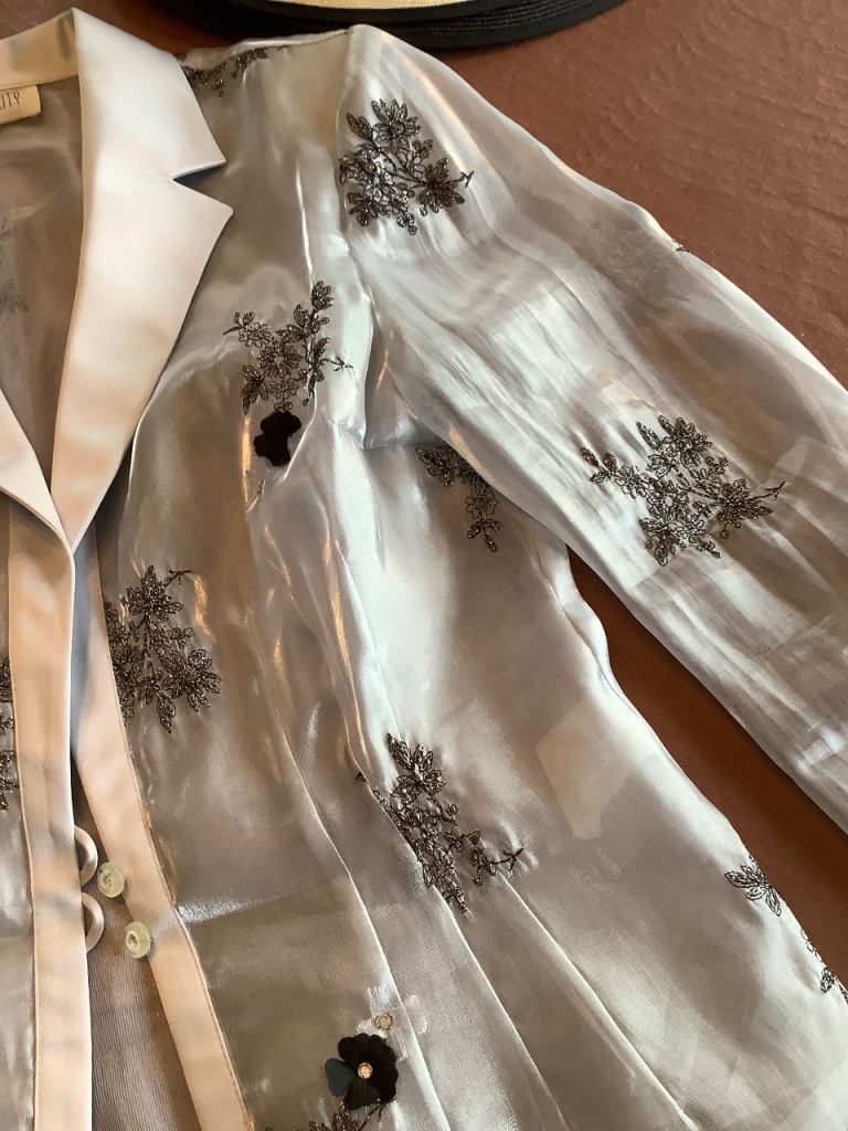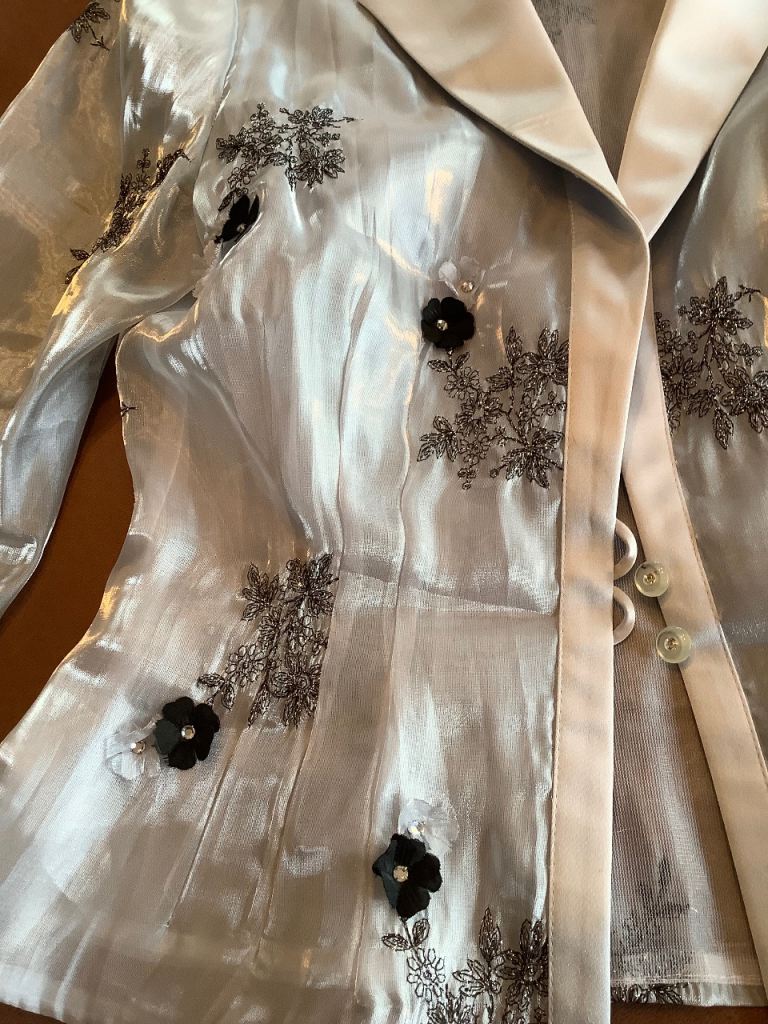 Lovely American dress & jacket, it says size 8, but it’s a U.K. size 12, in lovely condition, worn once. Fully lined silvery grey satin dress, and the jacket is lined & sheer sparkly grey with satin collar, and lovely sparkly embroidered black, white and grey flowers, also comes with a free matching hat. Ideal for weddings, formal events, or to wear the jacket separately with black or grey skirt or trousers. From smoke and pet free home.