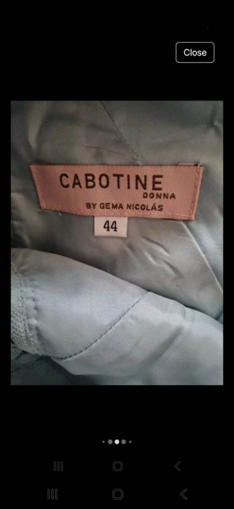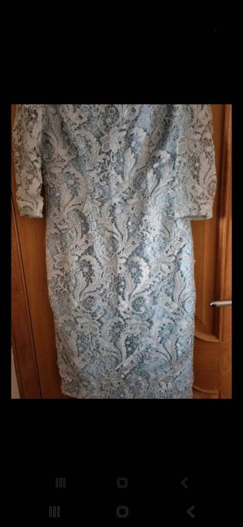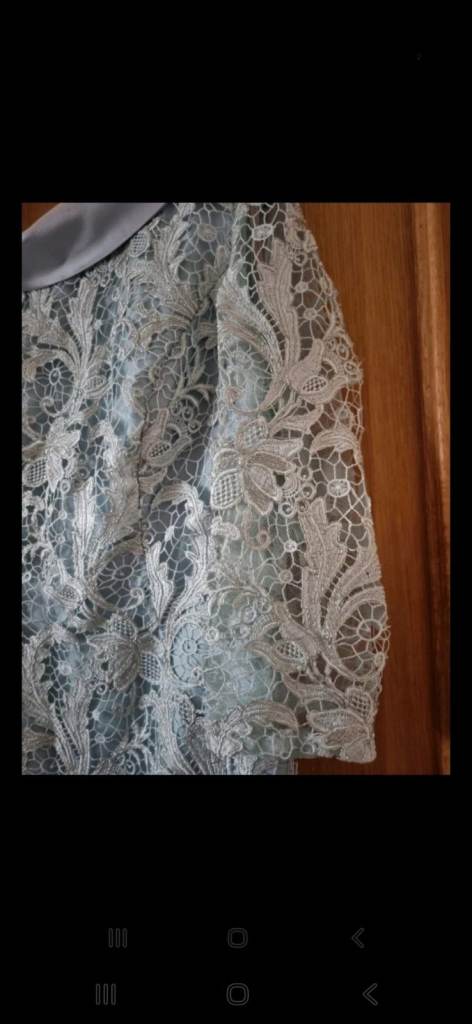 It has an allover colour mint green not as blue in some photos with a striking eye catching embroidered openwork mint green floral design which is edged in silver.