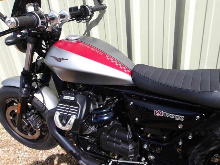 Moto Guzzi V9 Bobber, Previously supplied by ourselves & in Immaculate condition, She has only covered 8547 miles from new with some tasteful extras which include DPM alloy head protectors, Adjustable levers, Italian Zard exhausts costing over £1000 & originals, Dart tinted fly screen, Bar end mirrors, Fork gaiters, R&G heated grips, TomTom power lead, USB port, Service record, 2 New Tyres, 2 Keys, Hpi / DVLA History checked, Only £5695.