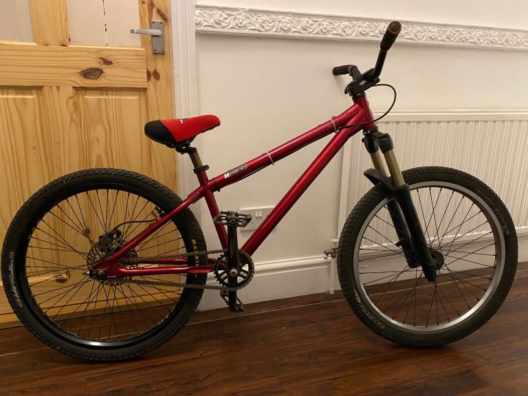 24Seven dark angel slacker frame, manitou forks, halo rear wheel/hub, atomlab front wheel/hub, wethepeople sprocket, race raceface stem, dmr bars and pedals, gusset single link chain, hayes rear disc.