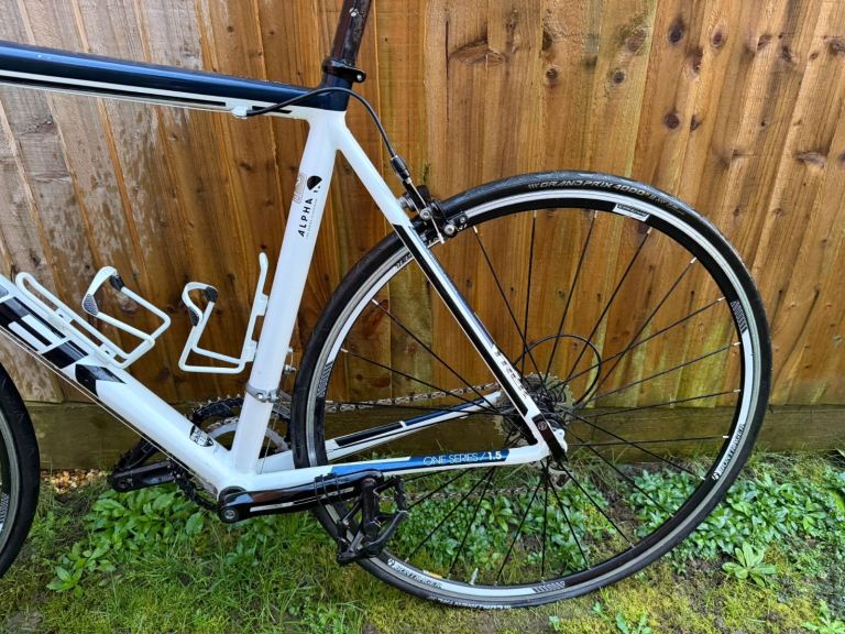 Great bike for starting out your road riding. Sleek aluminium frame in white with blue details. Large frame size 56 inch. Cleats pedals and normal pedals.