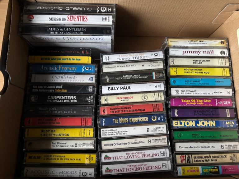 42 music cassettes all complete & in good condition, they include 12 Various artist albums 1970s - 1990s. 4 film theme cassettes. 13 greatest hits albums from artists such as Rod Stewart, George Michael, Billy Joel, Neil Sedaka, Neil Diamond etc. 3 cassette singles from Go West, Elton John & John Secada & more. See second photo. Buyer collects, no offers.