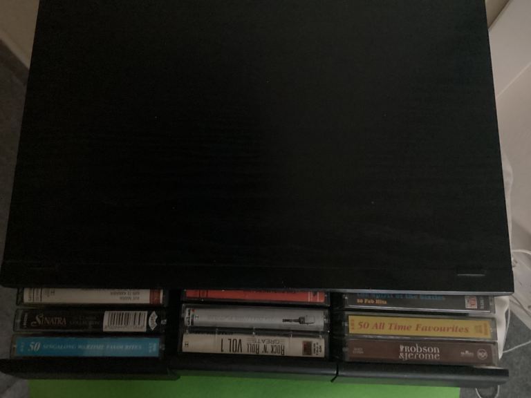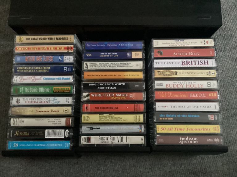 A vintage black plastic 3 drawer storage unit for cassette tapes .37cm x 25cm x 10 cm .Holds 36 cassettes . Separately cassettes as shown are from £3-00 each , 30 in total .