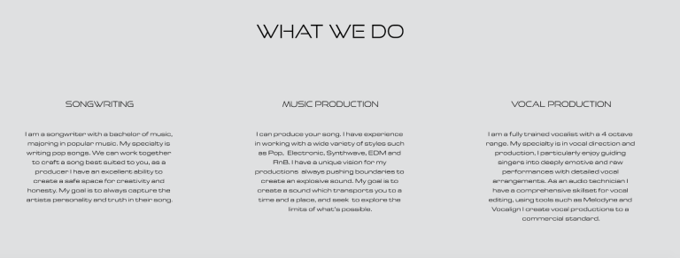 I’m a producer and songwriter with a bachelor of music from the University of Auckland (New Zealand). I specialise in electronic pop music and vocal production. I'm a fully trained vocalist and instrumentalist (guitar and keyboard).