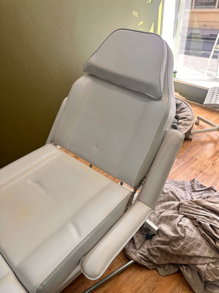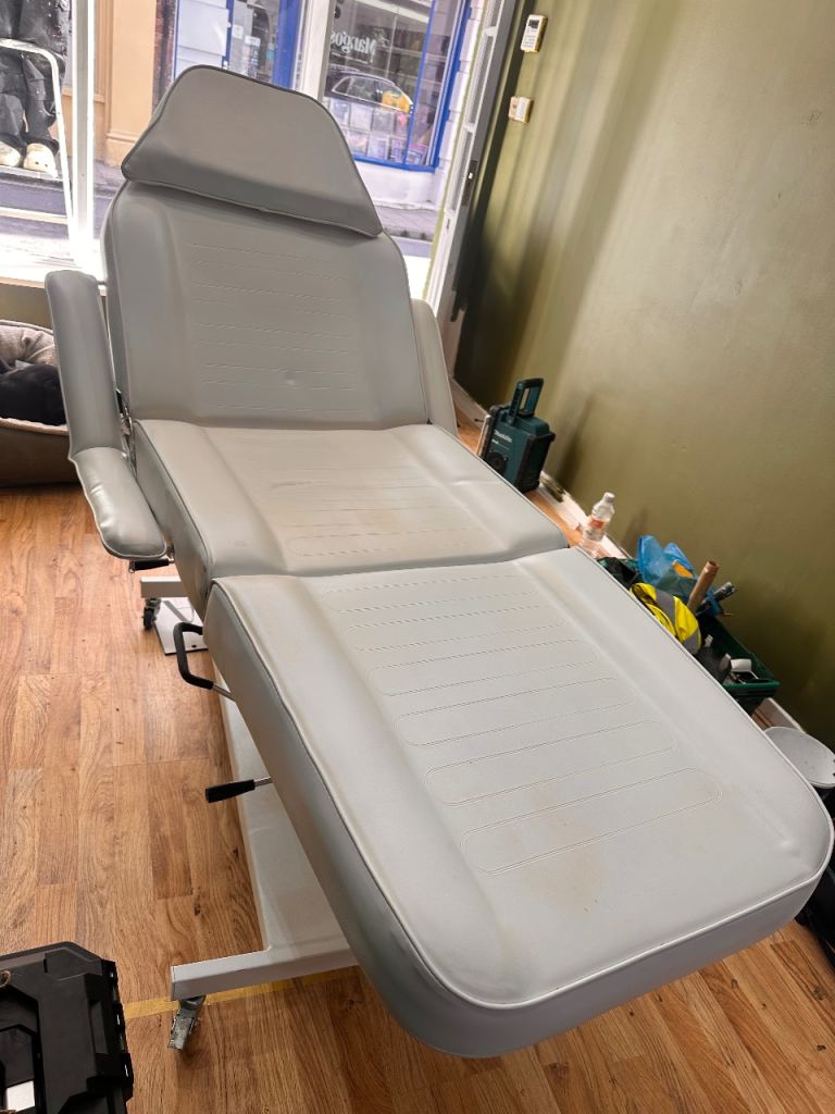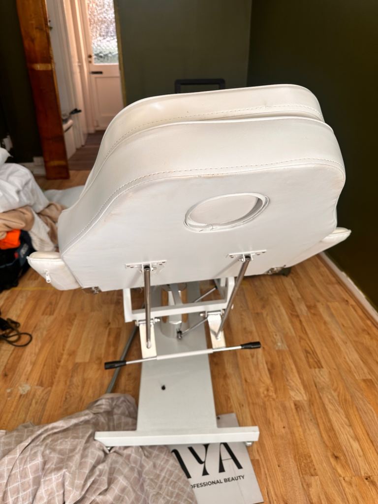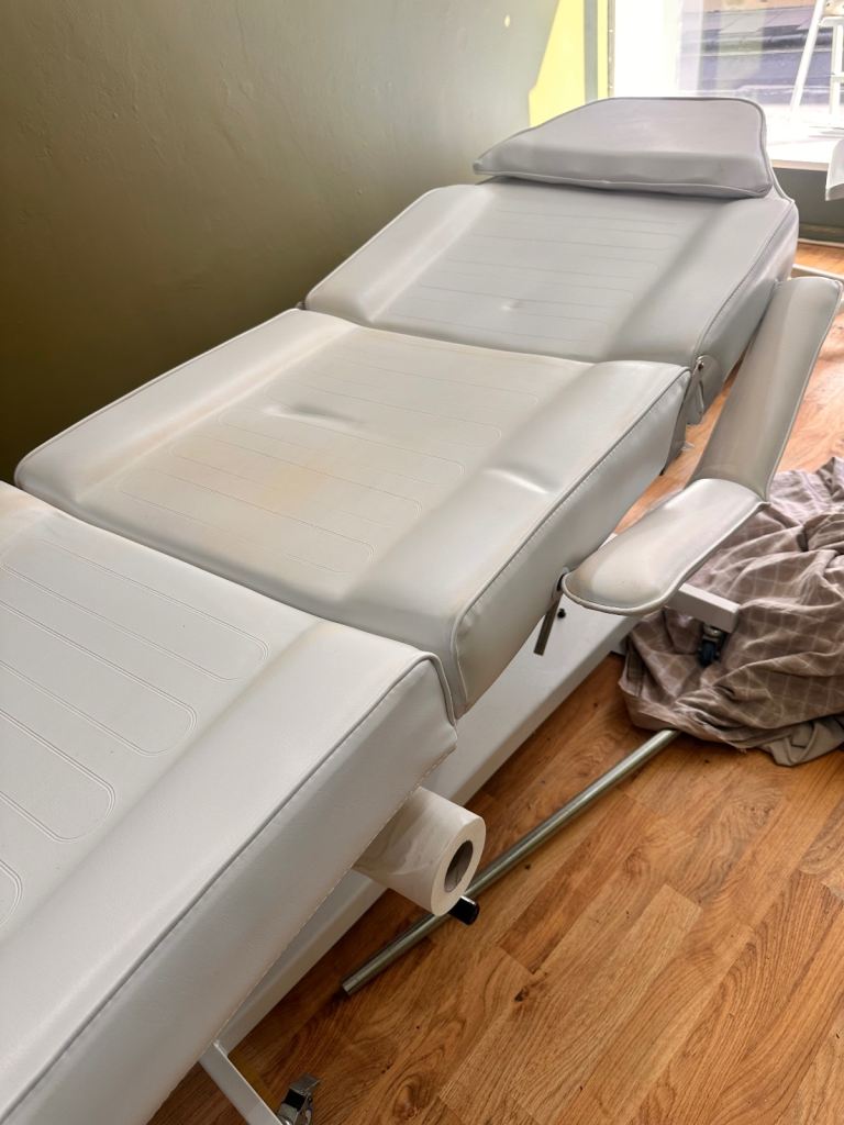 Adjustable white treatment chair/bed, versatile for various professional settings.