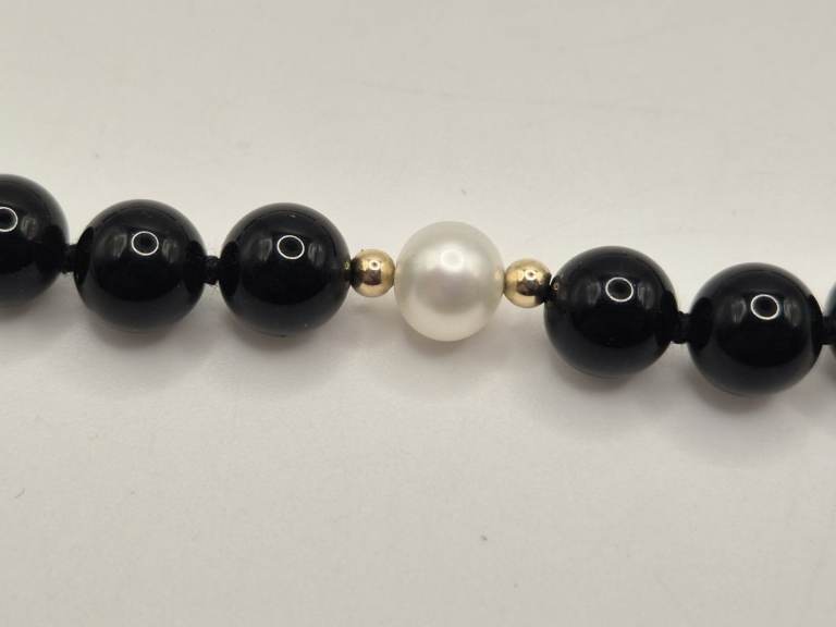 14kt yellow gold, pearl and black onyx bead necklace. 24 inch long, £70. Can be posted.