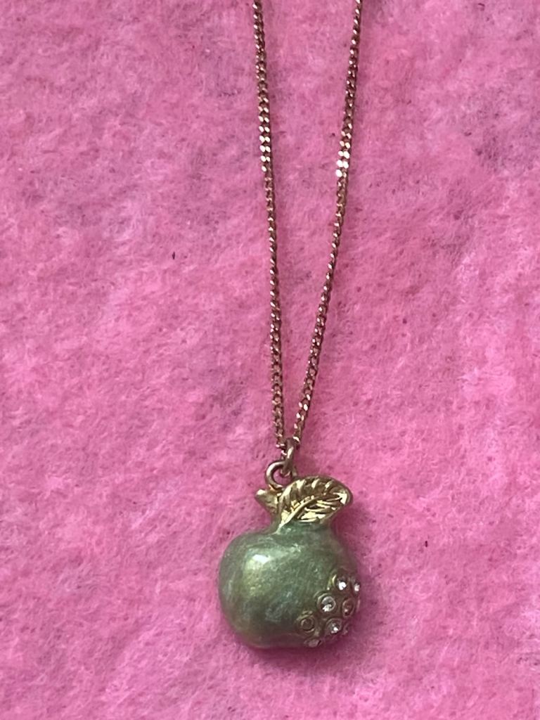 Set of 1 ….. brand new metal gold tone apple necklace / rhinestone. / green.