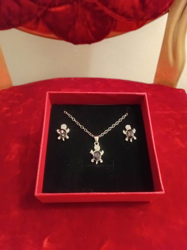 BEAUTIFUL BRAND NEW SILVER DESIGN WITH PURPLE GLASS CRYSTALS DESIGN EARRING AND MATCHING NECKLACE SET IN RED BOW BOX,HAS NEVER BEEN WORN,UNWANTED GIFT,WAS VERY EXPENSIVE GRAB A BARGAIN £5