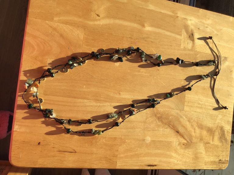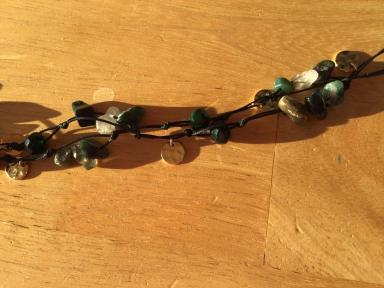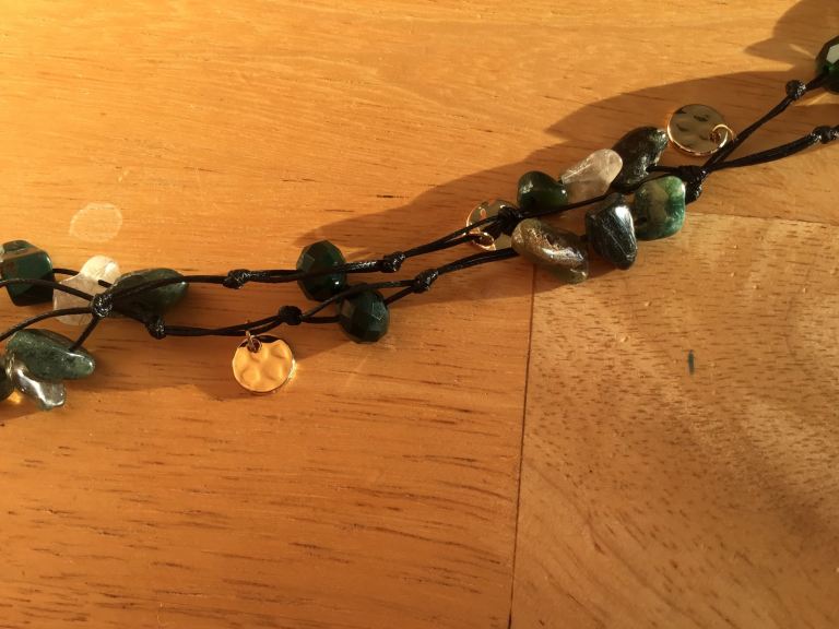 A brand new necklace in subtle colours : black , dark green , transparent glass and gold.