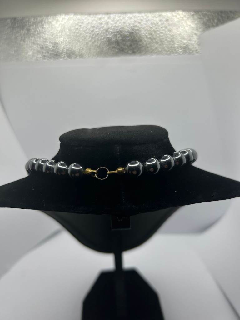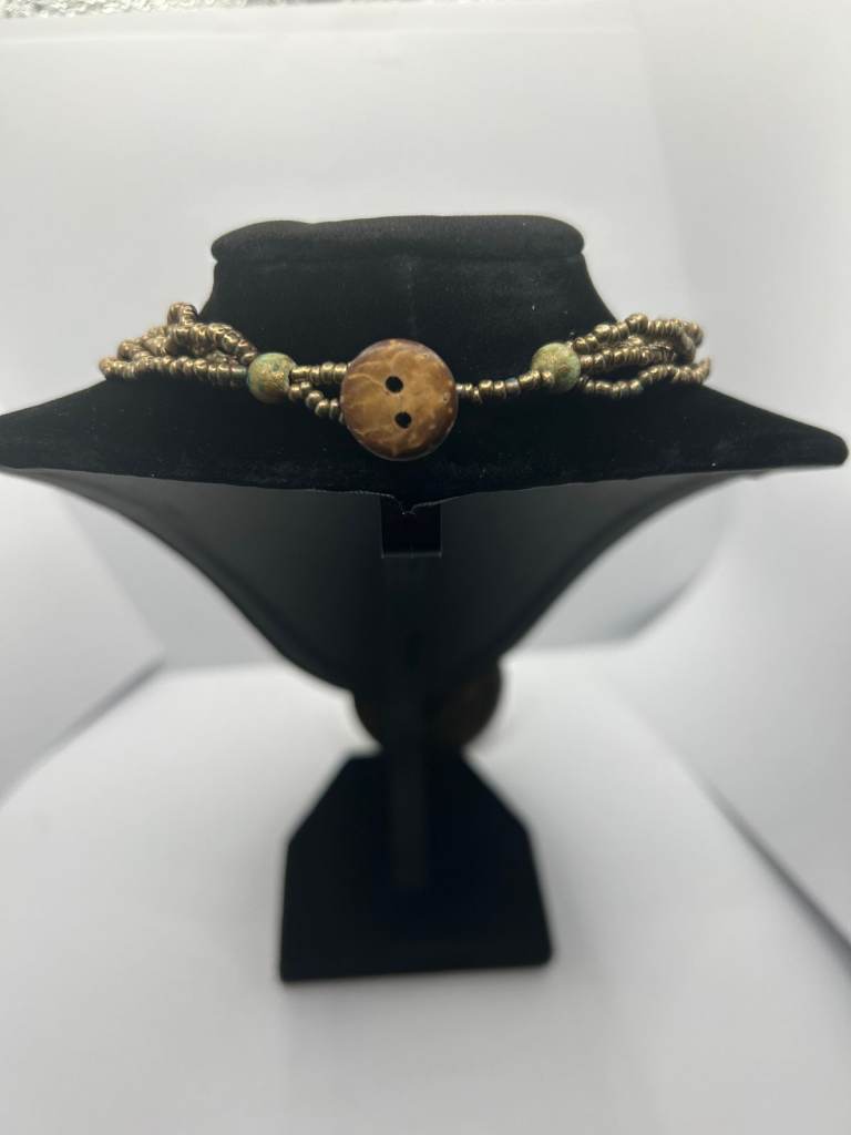 Design: multi-strand gold-tone beaded statement necklace with a large round pendant