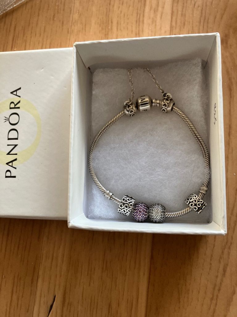 Pandora bracelet with safety chain, spacers and bead charms £80 ( can split)