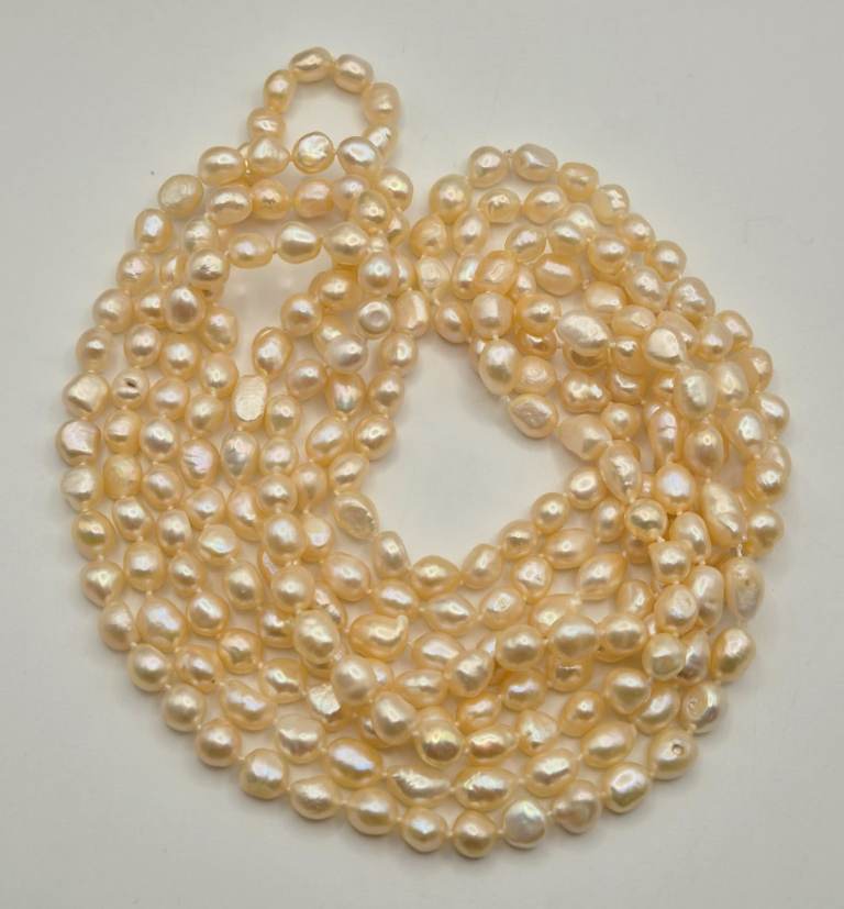 102 inch opera length peach baroque pearl necklace, knotted between pearls. £90, can be posted.