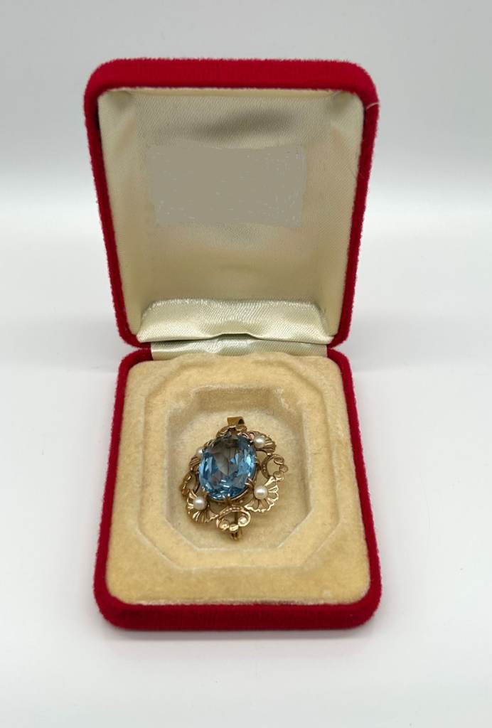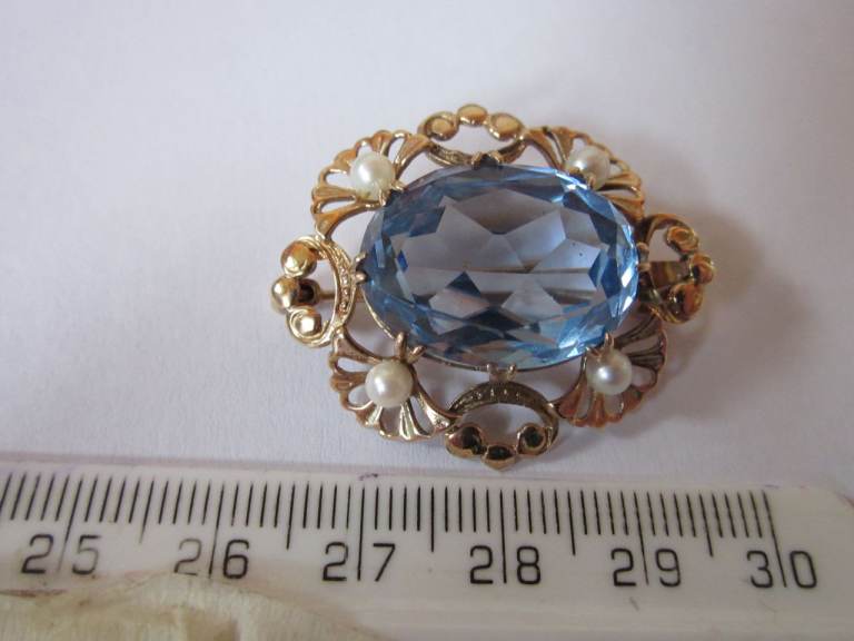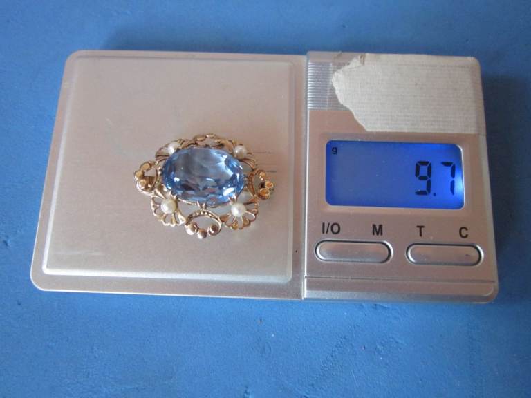 Bought Auction a while ago,the Stone was listed as an Aquamarine The stone alone is 20mm long and 15mm wide and weighs approx 15cts The brooch in total weighs 9.7grams I have not had the stone tested myself so am selling as an Aquamarine Coloured Stone and buyer must decide If genuine,true value is double my asking price Hallmarked for Birmingham 1970 Makers Initials EFC Comes in box shown with post to UK only free or collect Greenock Area