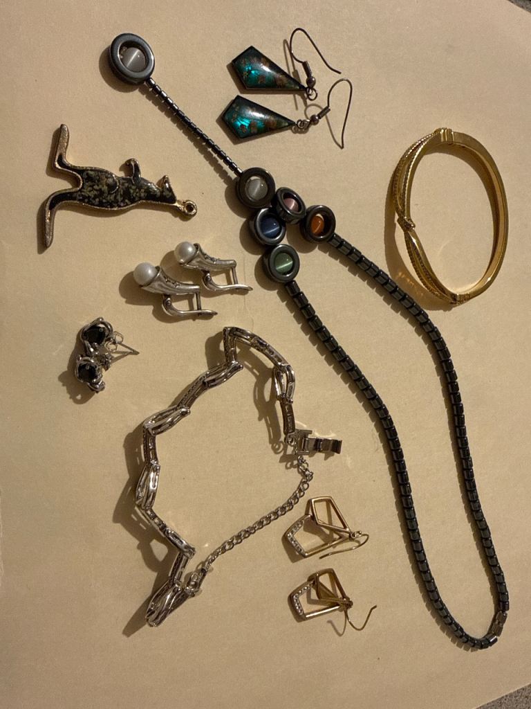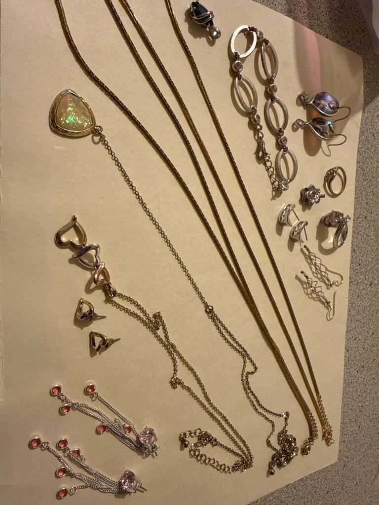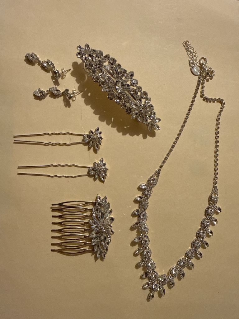 Some items are new, and some gentry used but in a good condition. Some made out of silver, swarowski crystals, metal, glass, pearls but not sure if its real pearls. All items come in a white gift box or in a mesh gift jewelry bag. Items are from £25 to £50. Depends on the item and if it comes in a pair with other items like a set. Text me for more details on a particular item and its price. The last photo shows a fancy belt for a dress.