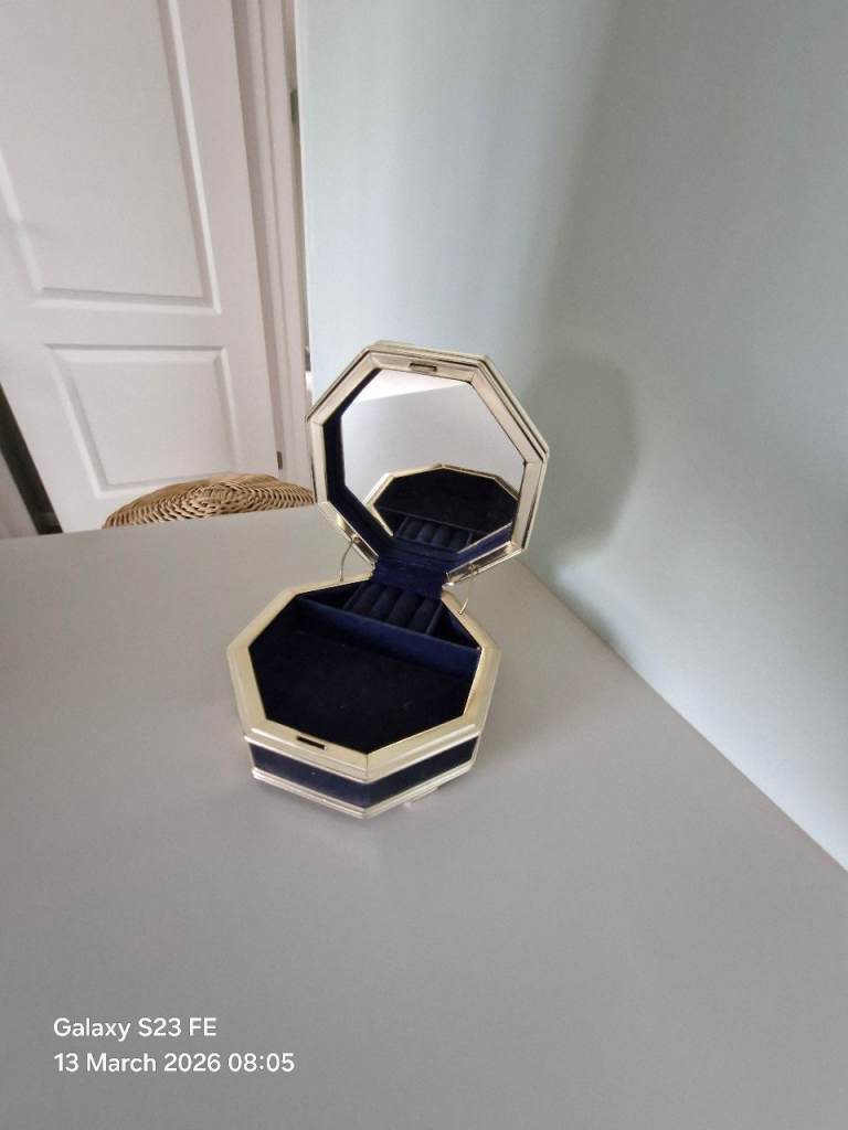 Vintage 6 inch octogan blue velvet & gold metal jewellery box lined with mirror. This is in good condition. Collection from Hellesdon.