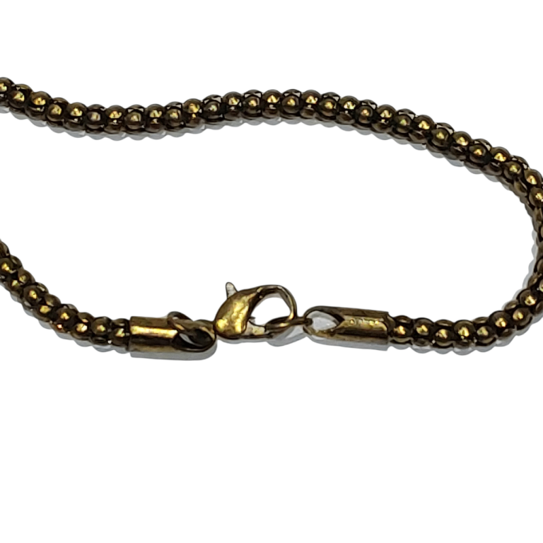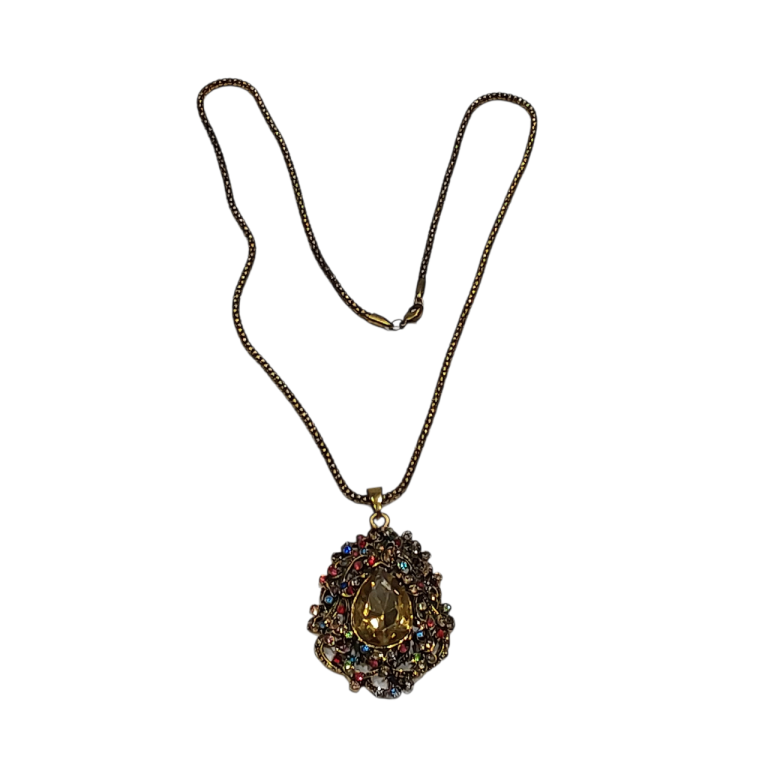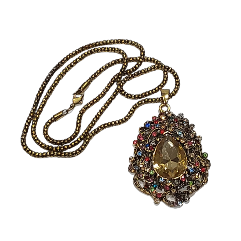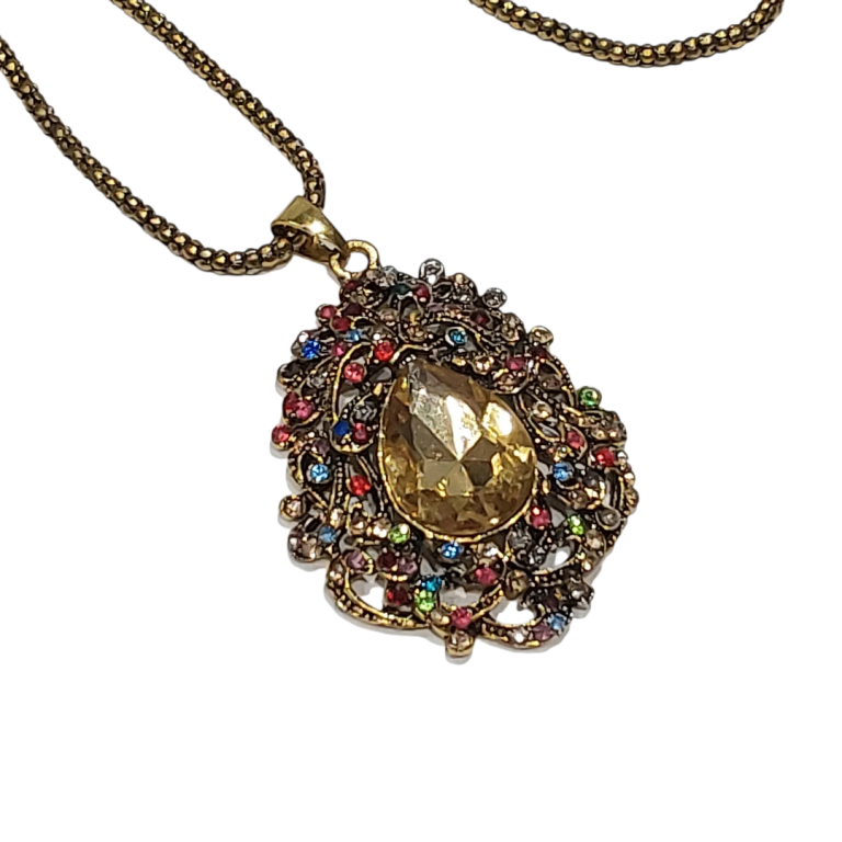 Unused item. This item was left in the storage for few years and never been worn. Large amber stone in the middle surrounded by colourful stones set in decorative design pendant. The chain is gold ball style. The whole jewellery has patina effect.