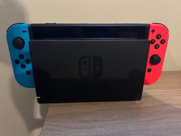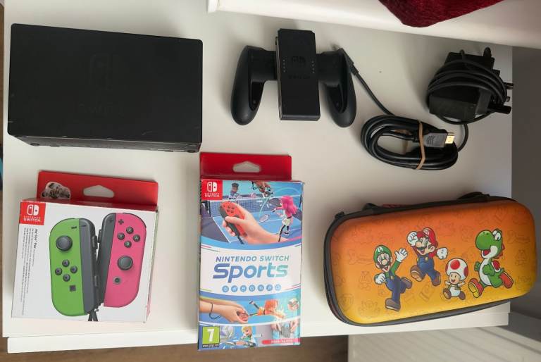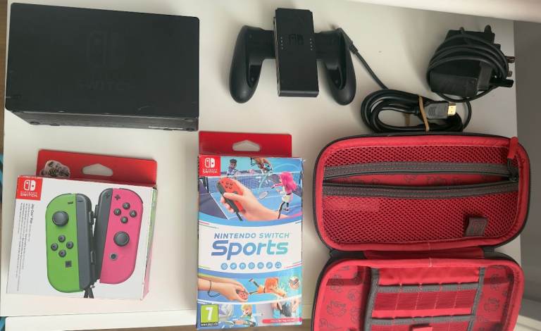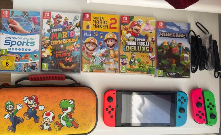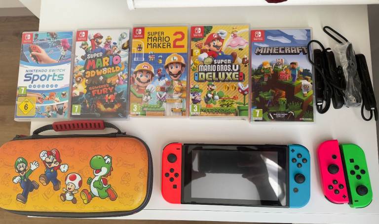 Nintendo Switch (Neon Red/Blue), extra controller, and 5-game bundle.
