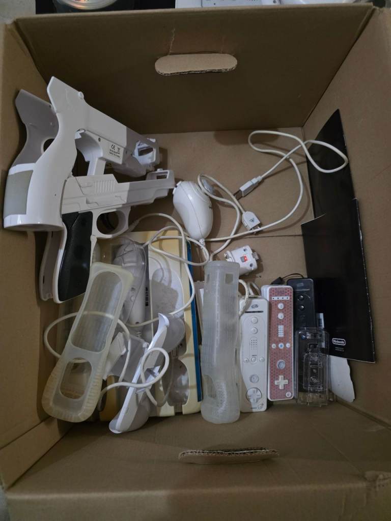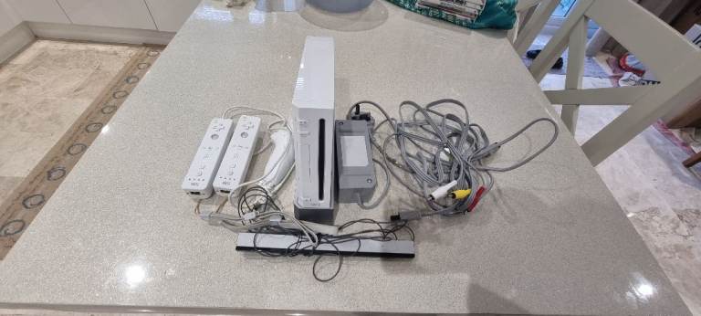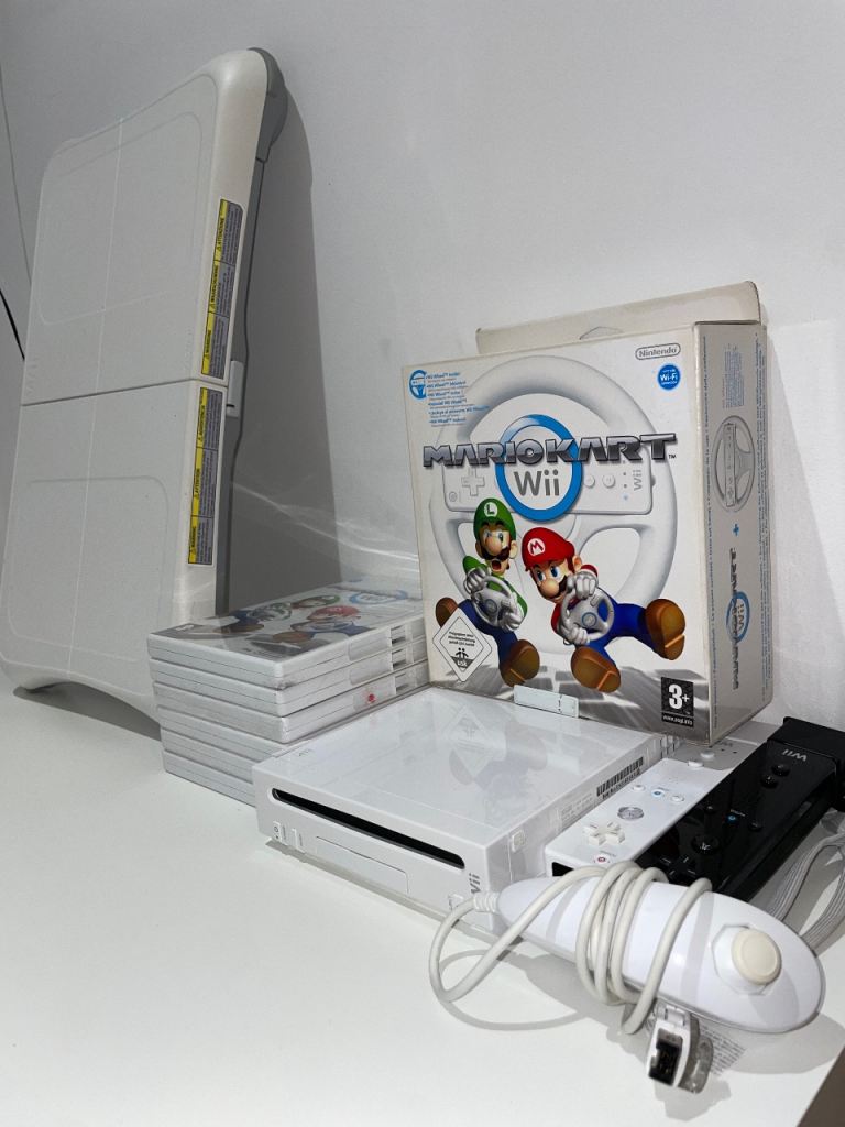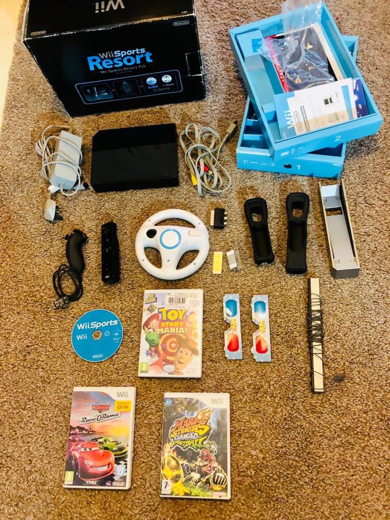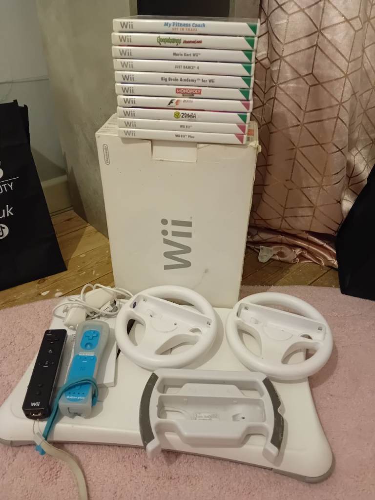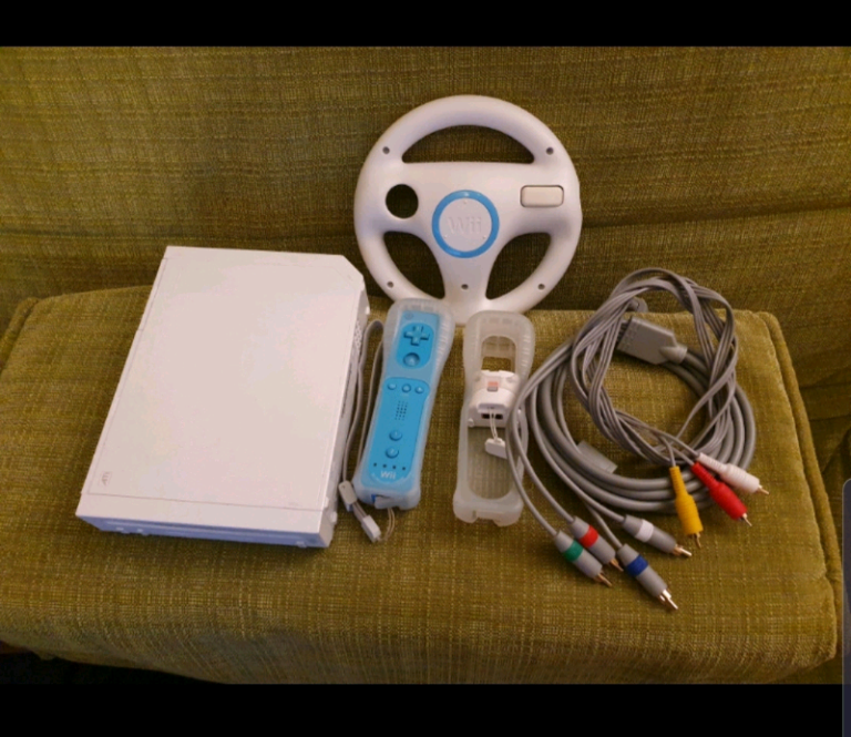 Console, rare blue original Wii controller, silicon pouch, sensor, power source, steering wheel