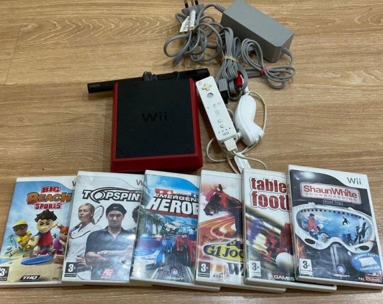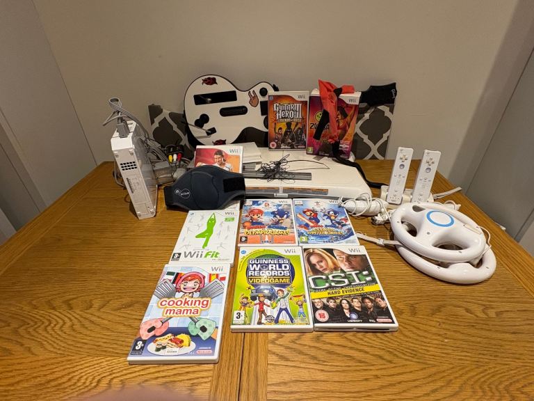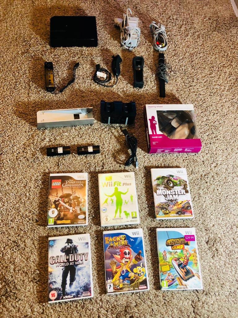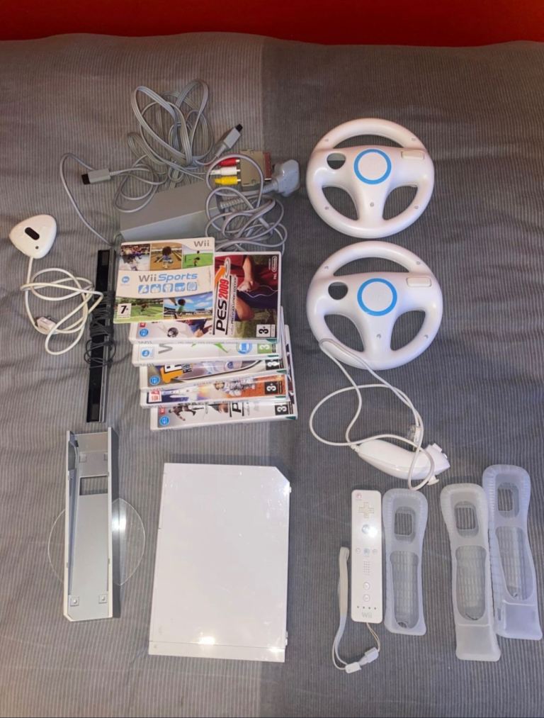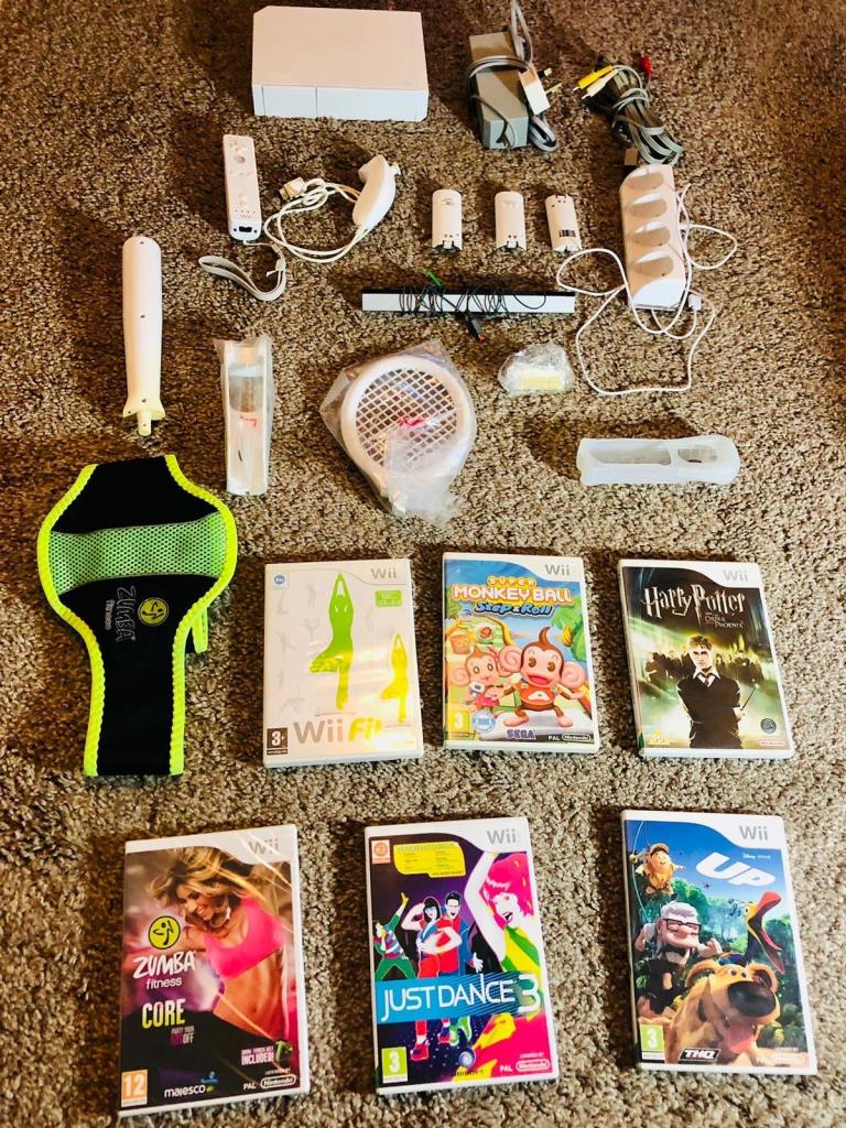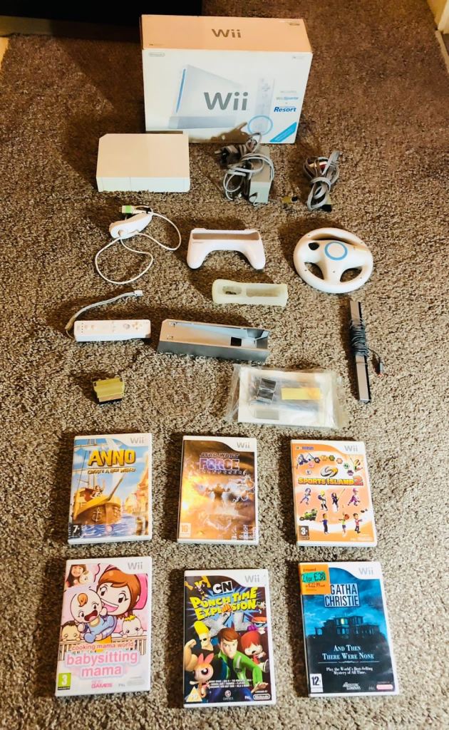 You get: 8x Wii games, NEW Sensor bar wired infrared receiver, 1X Wii controller & 1x numchuck, AV wire Plug and Power Pack plug. Also the booklets and Wii console manuals all in one bag and tennis racket & steering wheel
