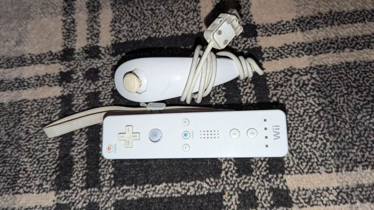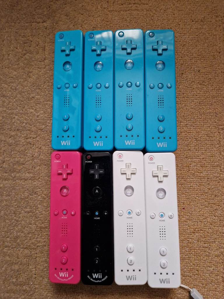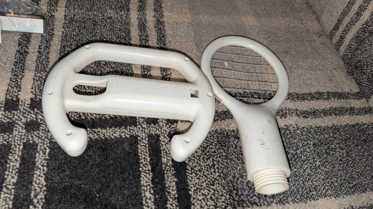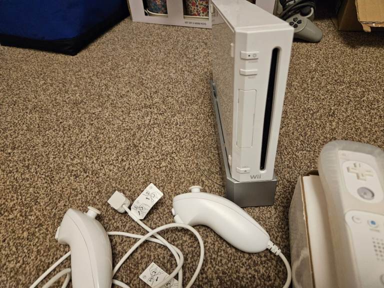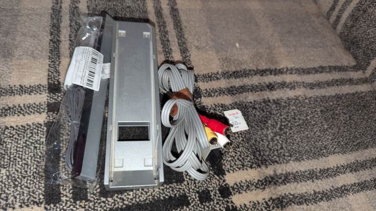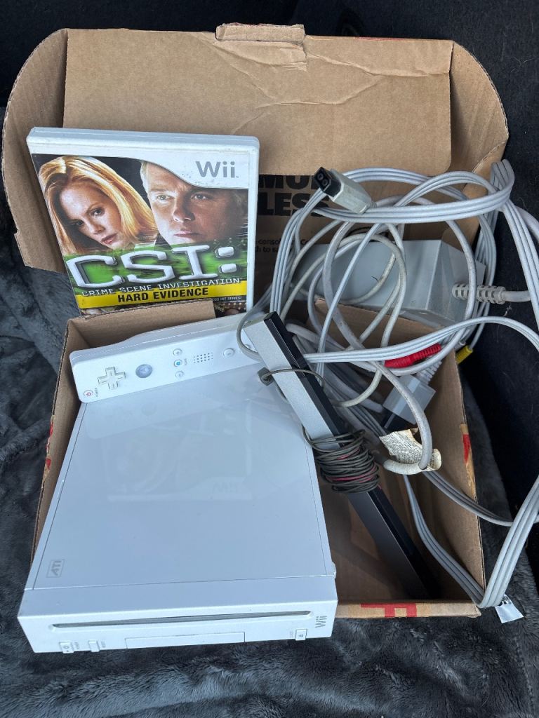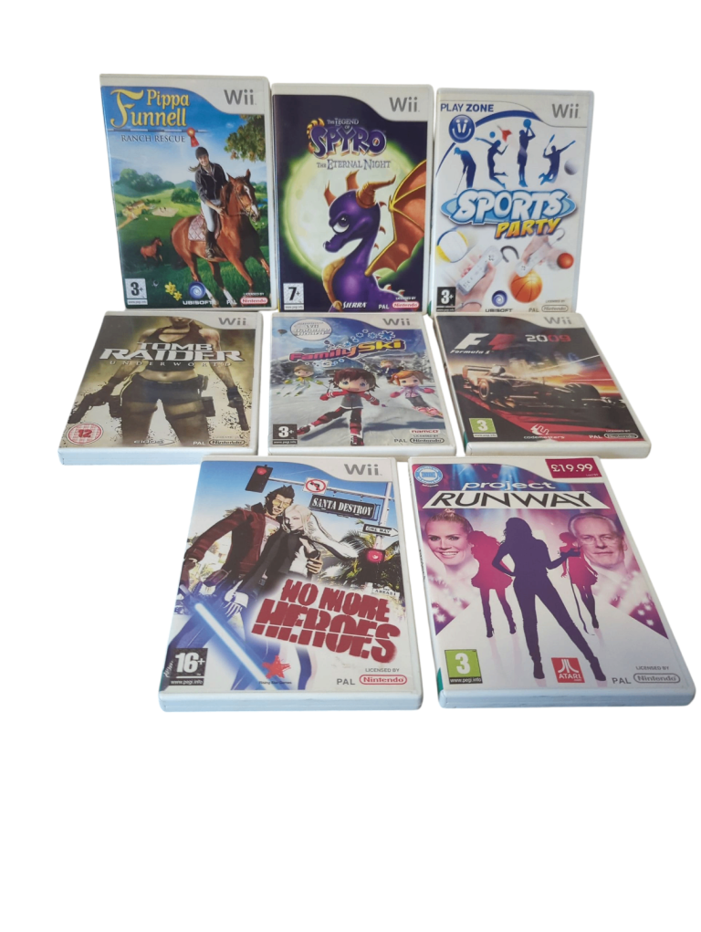 You get: 8x Wii games, NEW Sensor bar wired infrared receiver, 1X Wii controller & 1x numchuck, AV wire Plug and Power Pack plug. Also the booklets and Wii console manuals all in one bag and tennis racket & steering wheel