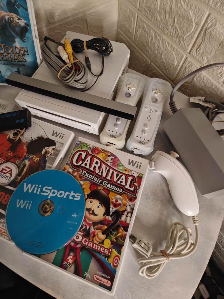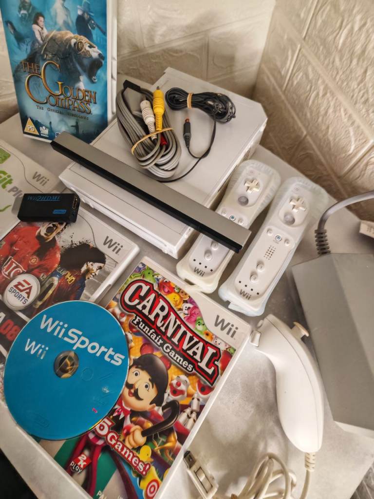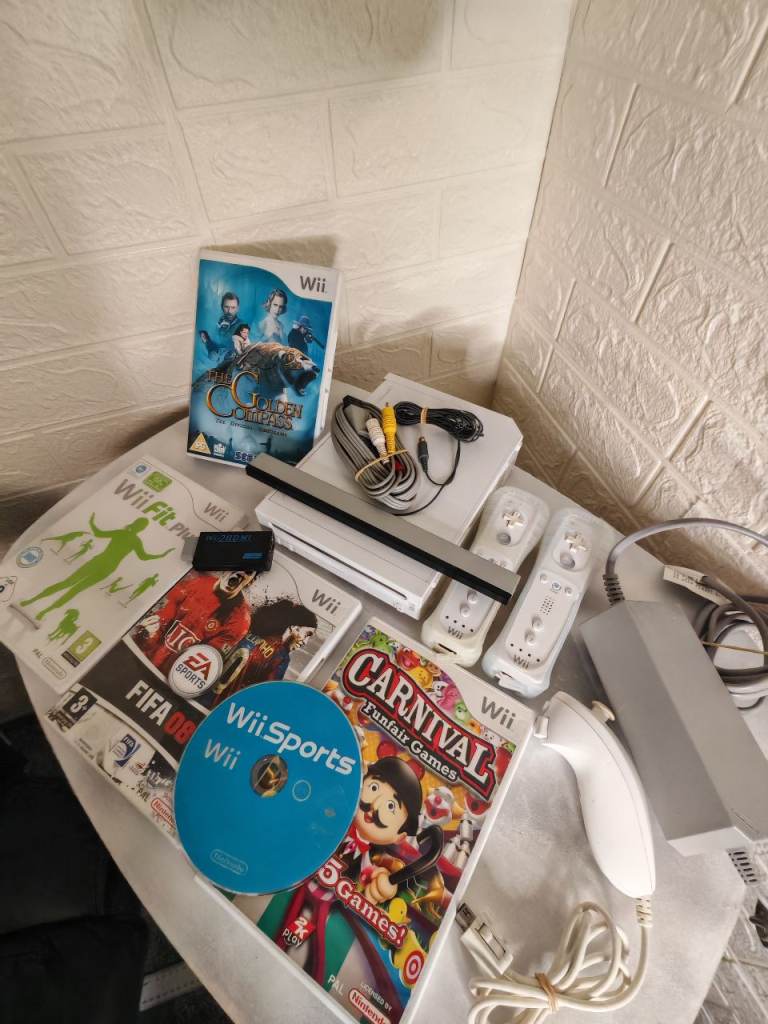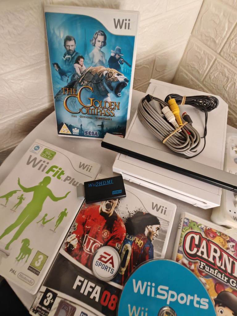 Comes with five games: Wii Sports, Wii Fit, Carnival Games, FIFA 08, and The Golden Compass. Collection form cr0 3r