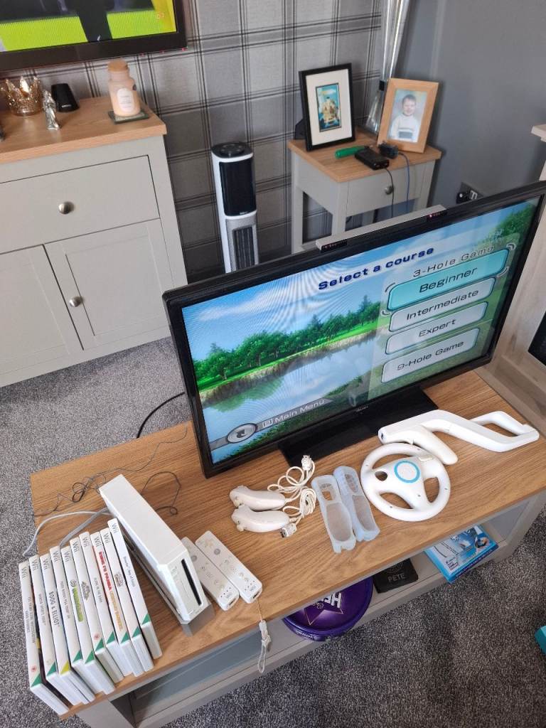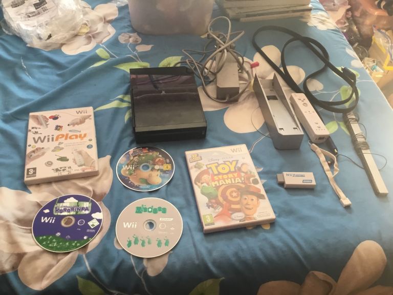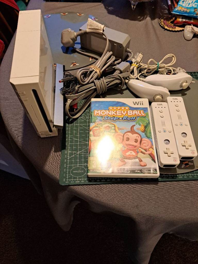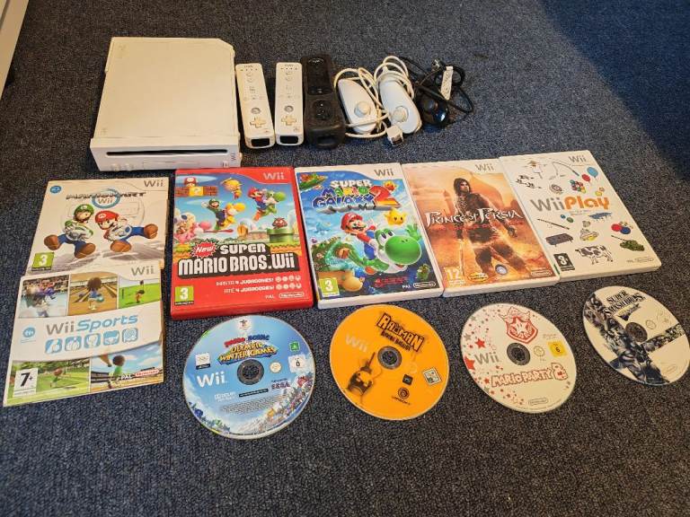 Wii console plus Wii fit balance board and Wii fit game. Controllers, Mario and sonic, just dance and Wii play games.