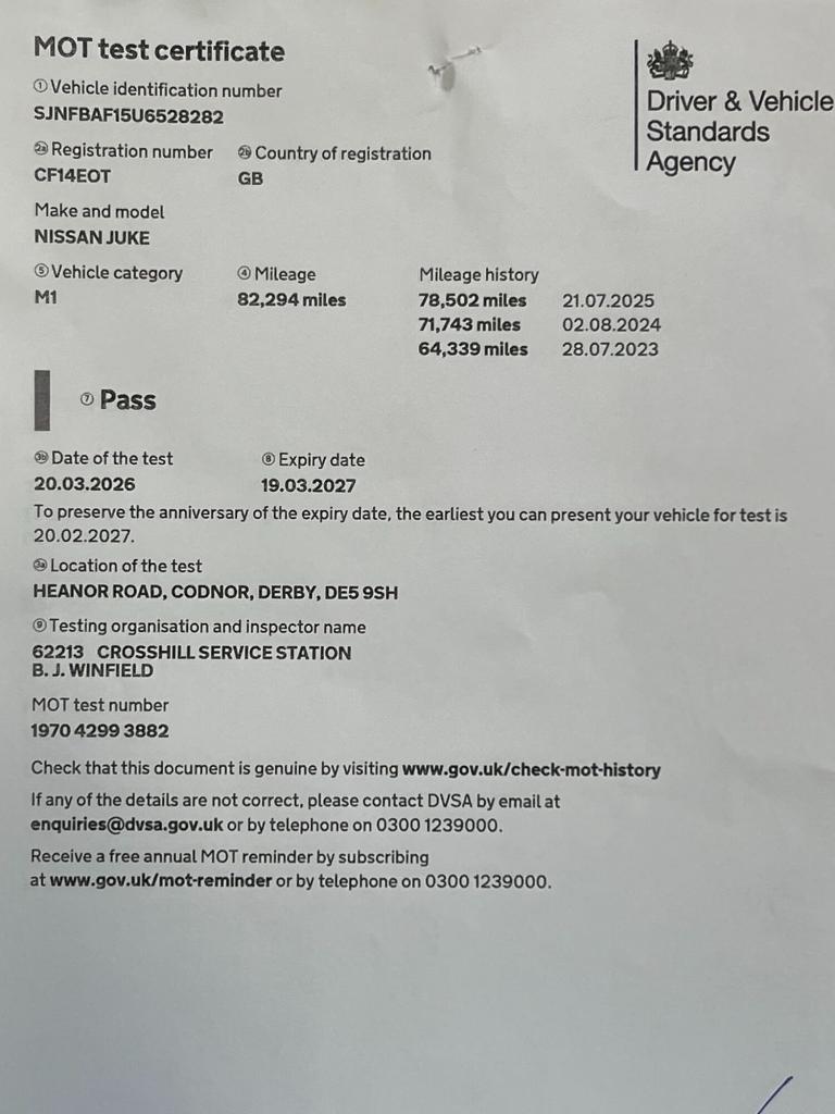 This Nissan Juke n-tec from 2014 offers excellent peace of mind with its MOT valid until March 2027 and a clear vehicle history check. It has been well maintained, with its last service completed on 2nd April 2026 at 83,015 miles, and comes with a 3 month warranty for added reassurance. Under the bonnet, you'll find a responsive 1.6 litre petrol engine, and the n-tec trim level ensures you benefit from convenient features such as Bluetooth telephone integration, climate control air conditioning, and a colour reversing camera to assist with parking.The Juke n-tec stands out with its impressive fuel economy, achieving up to 47 miles per gallon, which is better than many other vehicles in its class. Furthermore, its low CO2 emissions contribute to a more environmentally friendly drive, and it also falls into a low insurance group, making it an economical choice for everyday motoring.Station27 Car Sales are delighted to offer this 2014 Nissan Juke for sale with only 83015 Genuine miles, our car comes with;- MOT UNTIL MARCH 2027 WITH NO ADVISORIES - SERVICE HISTORY- LAST SERVICED IN APRIL BY OURSELVES - BOTH REMOTE KEYS - NEW SET OF TAILORED CARPET MATSOur Juke is ready to drive home today and is equipped with a Sat Nav, reverse camera and Bluetooth phone and Audio. This has been recently serviced by ourselves and also has an Mot until March 2027 with no advisories.