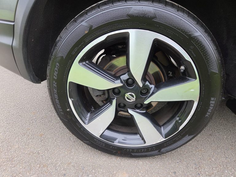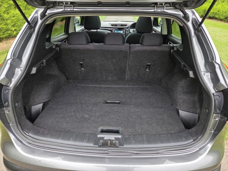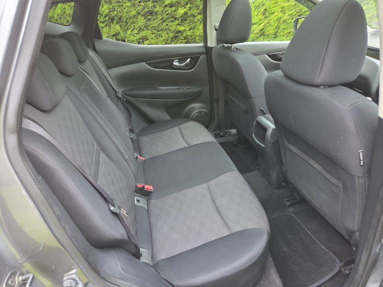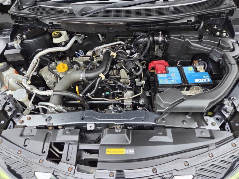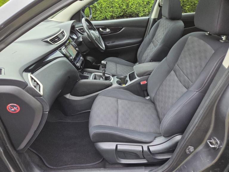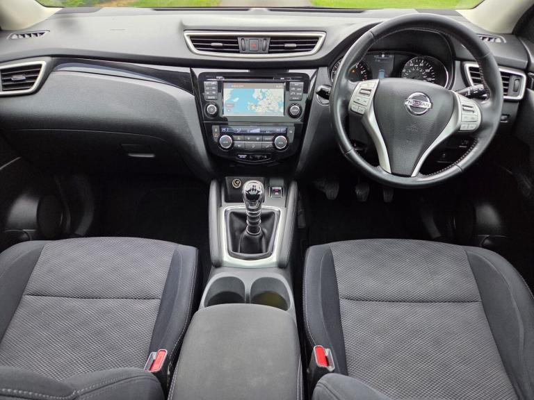 Child locks on rear doors, Curtain airbags, Driver/front passenger airbag, Height adjustable front seatbelts, Side airbags, Three 3 point rear seatbelts, Tyre pressure monitoring system, Alarm, Immobiliser, Intelligent Key, Remote central locking, Anti-lock Brake System, brake assist and Electronic Brakeforce Distribution, Electronic parking brake, Electronic Stability Programme + traction control, Hill start assist, Electric folding and heated door mirrors, Interior mirror with automatic anti dazzle, 2 speed wipers+variable intermittent wipe, Electric front/rear windows, Privacy glass, Rain sensor windscreen wipers, Rear wiper, Black honeycomb front grille, Body colour bumpers, Body colour door mirrors and handles, Chrome window surround, Panoramic sunroof with one touch shade, Satin silver roof rails, Solid paint, Automatic headlamp activation, Front fog lights with chrome surrounds, High beam assist, LED daytime running lights, 60/40 split folding rear seat, Driver's lumbar support, Driver/passenger front seatback pockets, Front headrests, Front seat belt pre-tensioners with load limiters, Height adjustable driver's seat, Height adjustable passenger seat with lumbar support, Isofix child seat preparation, Rear headrests, Ambient interior lighting, Footwell ambient lighting, Illuminated glovebox, Map reading lamp, 12V socket, Cloth upholstery, Front armrest, Front cupholders x 2, Leather gearknob, Leather steering wheel, Luggage area divider, Rake/reach adjustable steering wheel, Rear armrest with 2 cupholders, Dual zone climate control, Pollen filter, Push button starter, Around View Monitor, Cruise control, Forward collision warning, Front and rear parking sensors, Lane departure warning system, Power assisted steering, Speed limiter, Traffic sign recognition, Nissan connect sat nav system, Service interval indicator, Trip computer, Bluetooth phone integration system, 6 speakers, Audio remote control, DAB radio/CD player, USB/aux input socket, 18" Alloy wheels, Tyre puncture repair kit