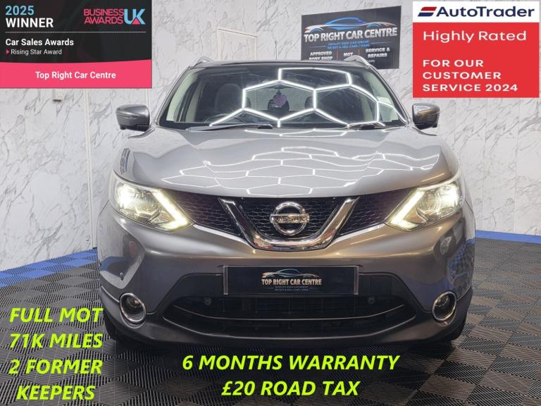 *** NIL DEPOSIT FINANCE AVAILABLE *** ***HPI CLEAR***6 MONTHS WARRANTY AND BREAKDOWN COVER WITH THIS CAR.2 former keepers only. Low 20 pounds road tax. Low mileage 71k miles.FULL SERVICE HISTORY. FULL MOT ON SALE. We just done the fresh service.This stunning Nissan Qashqai 1.5 dci has been sourced directly from its Previous Private Owner. Every now and again, a car comes into stock at Top Right Car Centre, that you cannot help but fall in love with.Top Spec TEKNA has massive centre screen SATNAV, panoramic roof, full leather interior with heated seats, 360 degree bird view camera, privacy glass, parking sensors, all electric windows, auto folding electric side mirrors, electric seats, daytime running led lights, digital dual climate control, cruise control.Clean Car in Grey colour. Great comfortable family car. Well maintained body work and interior. Bullet fast response. Checked by our engineers. Professionally detailed. Good reliable runner. Price checked. We've just completed a full pre delivery inspection on the car to give you complete piece of mind. 2 central locking keys. Smooth gear box. Clean Alloy wheels. Excellent condition tyres. Multimedia has Bluetooth DAB RADIO CD mp3 AUX USB. Run with no fault strong reliable engine. Good fuel economy. First to see will buy it this well looked after car. p/x welcome. We do price our cars/van as competitively as possible and because of this we sell cars/vans very quickly. BE QUICK! MISS IT - MISS OUT. With so much variety, quality and highly rated award winner 2024 and 2025, it is no wonder we are super busy all the time. Why Buy From Top Right Car Centre?Thoroughly Inspected Cars. All our vehicles are quality-checked and HPi verified, giving you peace of mind with every purchase.Multi Award-Winning Family Business. As a trusted family-run business, we have earned awards for our customer service and expertise.Hand-Picked, Quality Cars. We carefully select only the finest cars with full service histories, so you can drive away with confidence.Test Driven for Assurance. Each car is personally test-driven by our team, ensuring it meets our high standards.Delivery Service available.