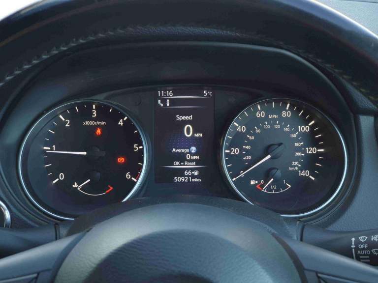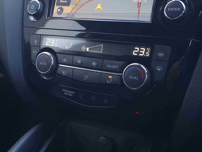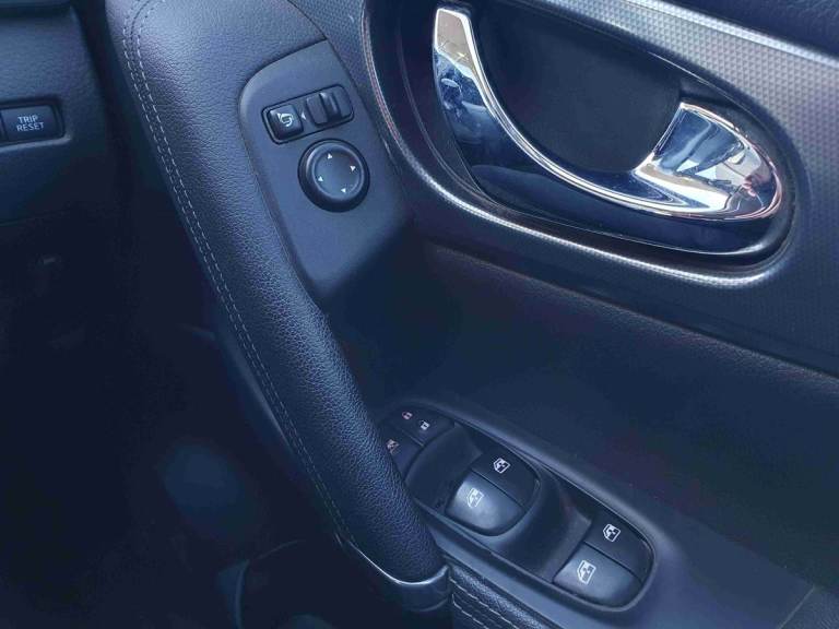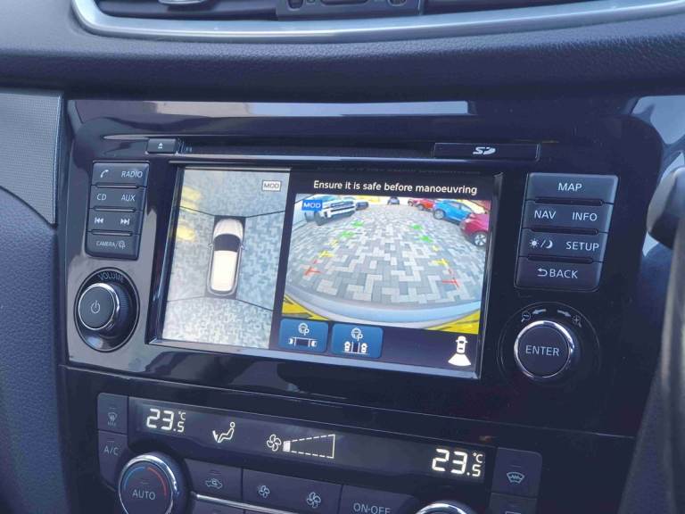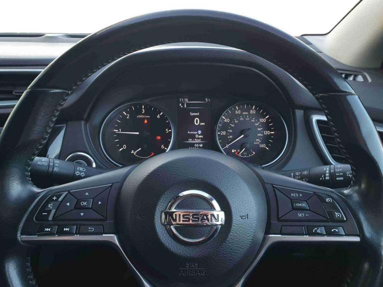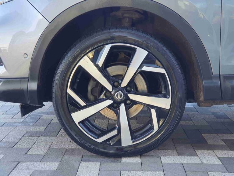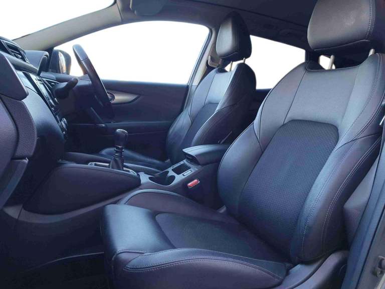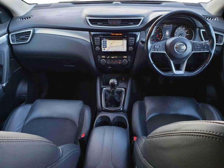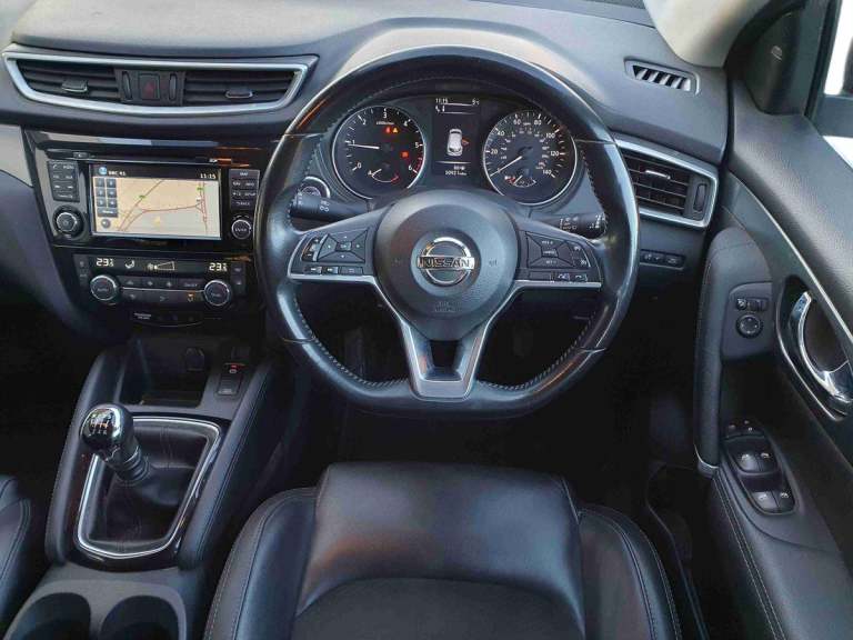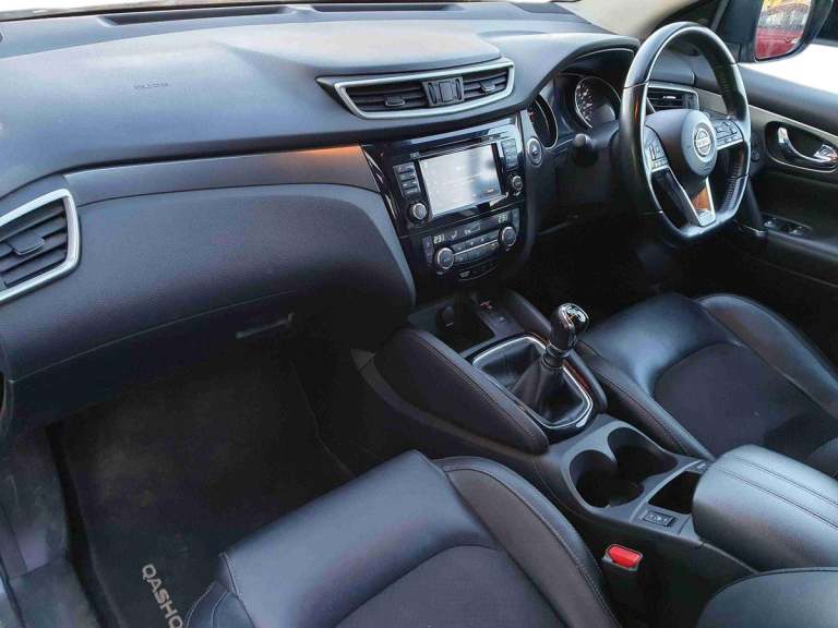 ..5'' TFT driver information centre, Around View Monitor, Blind spot monitoring, Bluetooth phone integration system, Cruise control, Electric speed sensitive power steering, Front and rear parking sensors, Intelligent parking assist, Lane departure warning system, Nissan connect sat nav system, Outside temperature display, Push button starter, Rear view camera, Service interval indicator, Speed limiter, Traffic sign recognition, Trip computer, Diesel particulate filter, 'Shark fin' mobile antenna, Bose premium 8 speaker system, DAB Digital radio, Radio/CD, Smartphone apps, Steering wheel mounted audio controls, USB/aux input socket, Automatic headlamp activation, Body colour bumpers, Body colour door handles, Body colour door mirrors, Chrome window surround, Electric folding and heated door mirrors, High beam assist, Interior mirror with auto anti dazzle, LED indicators in door mirrors, Matt silver roof rails, One touch electric front/rear windows, Privacy glass, Rain sensor windscreen wipers, Rear roof spoiler, Rear wiper, 2 X front 12v power sockets, 60/40 split folding rear seat, Ambient interior lighting, Centre console with armrest, Chrome interior door handles, Configurable luggage board system, Driver + front passenger lumbar support, Dual zone climate control, Electric adjust driver's seat, Front and rear door pockets with bottle holders, Front headrests, Front seat belt pre-tensioners with load limiters, Height adjustable driver's seat, Height adjustable passenger seat, Illuminated electric window switch, Isofix child seat preparation, Leather gearknob, Leather interior door handles, Leather knee rest, Leather steering wheel, Luggage compartment lighting, Parcel shelf, Part leather upholstery, Pollen filter, Rake/reach adjustable steering wheel, Rear headrests, Heat package - Qashqai, LED pack - Qashqai, ABS, brake assist and EBD, Child locks on rear doors, Curtain airbags, Driver/front passenger airbag, Electronic parking brake, ESP + traction control, Forward emergency braking, Front passenger airbag deactivation, Height adjustable front seatbelts, Hill start assist, Seatbelt warning, Side airbags, Three 3 point rear seatbelts, Tyre pressure monitoring system, Alarm, Immobiliser, Intelligent Key, Remote central locking, Graphite interior trim, Tyre puncture repair kit
