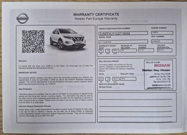 This 2019 Nissan Qashqai DIG-T Tekna+ boasts an MOT valid until November 2026, offering you peace of mind for the road ahead. This stylish SUV is powered by an efficient 1.3L petrol engine, meeting Euro 6 emission standards. Inside, youll find a comfortable and connected cabin featuring a comprehensive LED Pack with LED headlights, Bluetooth with audio streaming, and dual zone climate control air conditioning. The Tekna+ trim also includes the desirable Heat Pack for cosy journeys with heated seats, and the Drive Assist Pack which incorporates adaptive cruise control for effortless motorway driving. The Qashqai DIG-T Tekna+ stands out with its low CO2 emissions, indicating a more environmentally conscious choice compared to many other vehicles. Furthermore, its low insurance group rating means that running costs are kept to a minimum, making it an economical option for everyday use. These highlights demonstrate how this particular Nissan Qashqai offers a superior ownership experience, combining advanced technology, comfort, and cost effectiveness. Comes with 3 stamps in the Service Book as well as just being serviced by ourselves and it has 2 Keys. See below for its full list of features. Book today to view and test drive. Open 7 days a week. All part exchanges welcome. Please ask for details of our finance and extended warranty options, subject to status, Ts and Cs apply. ** You can reserve a car - without any obligation to actually buy it - by clicking on the green "Reserve Today" button on our website page - all we ask is for a fully refundable £99 holding deposit ** ** We offer Nationwide Delivery on most cars, so you can easily buy a car without visiting us ** ** We have built our reputation on nearly 50 years of Trust & Customer Service ** Please see our much-valued, genuine 5* reviews on Google, Autotrader & Facebook ** ** We are open Monday to Friday 9am - 6pm, Saturday 9 - 5 and Sunday 10 - 4 ** Please call us first on 01773 743333 if you are travelling from out of our area **.Nissan Connect 7in Touchscreen Navigation and Entertainment System, Tech Pack, Smartphone App Integration, Intelligent Park Assist, Intelligent Around View Monitor, Heat Pack, Bluetooth with Audio Streaming, Cruise Control with Speed Limiter, Black Nappa Leather with 3D Quilted , AM-FM-CD Audio System with DAB, Dual Zone Climate Control Air Conditioning, Glass Roof Pack, 19in Alloy Wheels, USB Port, AUX Socket for MP3 Player, Advanced Drive Assist Display , Selectable Steering - Normal or Sport, Interior Ambient Lighting, Front and Rear Electric Windows, Electrically Adjustable Drivers Seat, Electrically Adjustable Passenger Seat, Drivers Seat Memory Function and Door Mirrors, Electric 4-Way Lumbar Support on Driver Seat, Driver Seat Height Adjustment, Passengers Height Adjustment, 60-40 Split Rear Folding Seats, Leather D Shaped Steering Wheel, Steering Wheel Mounted Audio Controls, Centre Console Storage and Armrest, Leather Gear Lever, Tilt and Telescopic Adjustable Steering Wheel, Start Push Button, Trip Computer, Dark Headlining, Boot Light, LED Pack, Smart Vision Pack, Intelligent Auto Headlight, Auto Wipers, Electric Auto-Folding Door Mirrors, LED Signature Daytime Running Lights, Front Fog Lights, Matt Silver Roof Rails, Gloss Silver Door Mirror Caps, Chrome Glass Surround, Rear Roof Spoiler, Pearl Black, ESP ABS EBD and Brake Assist, Drive Assist Pack, Hill Start Assist, AutoHold Function with Stand Still Assist, Electric Parking Brake, Electric Speed-Sensitive Power Steering, TPMS - Tyre Pressure Monitoring System, ISOFIX Child Seat Anchoring Points, Nissan Intelligent Key, Remote Central Locking with Superlocking, Thatcham Category 1 Alarm, Nissan Anti Theft System Immobiliser, Driver-Passenger-Side and Curtain Airbags