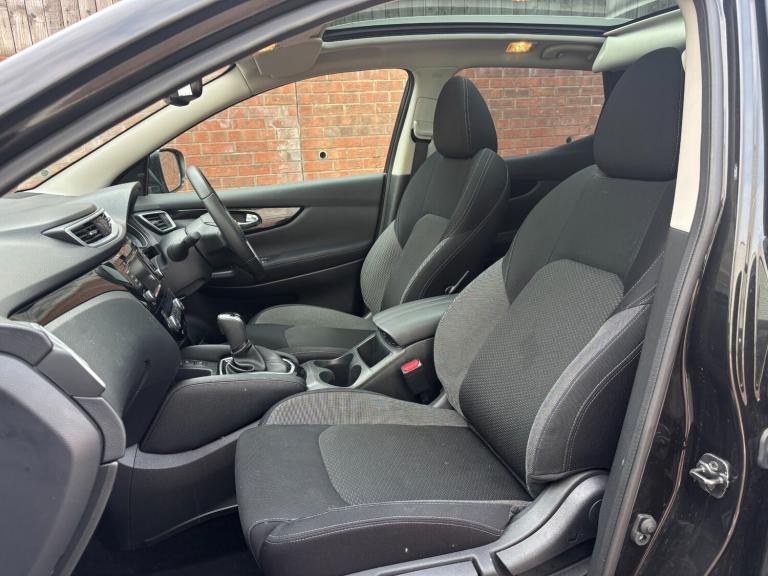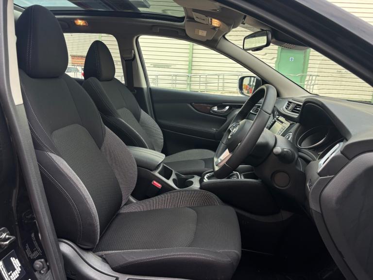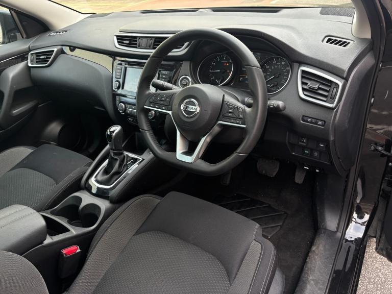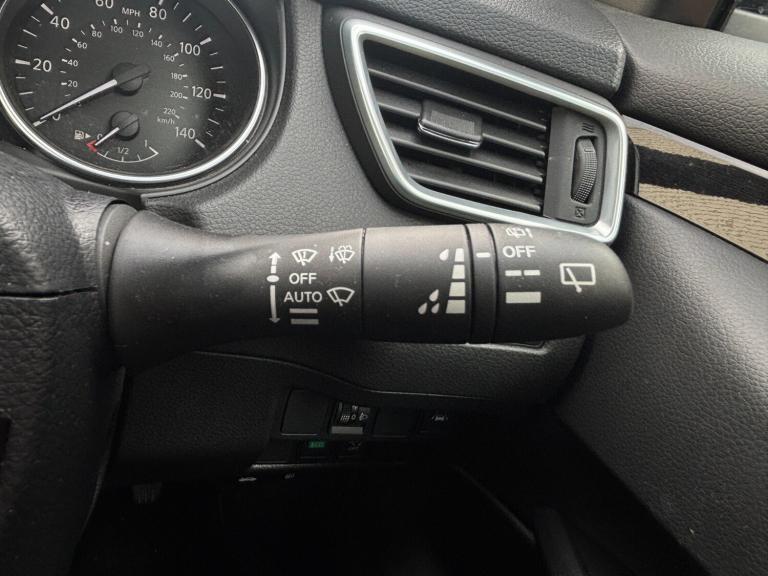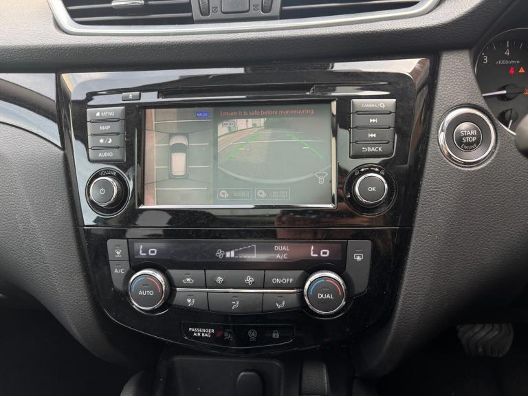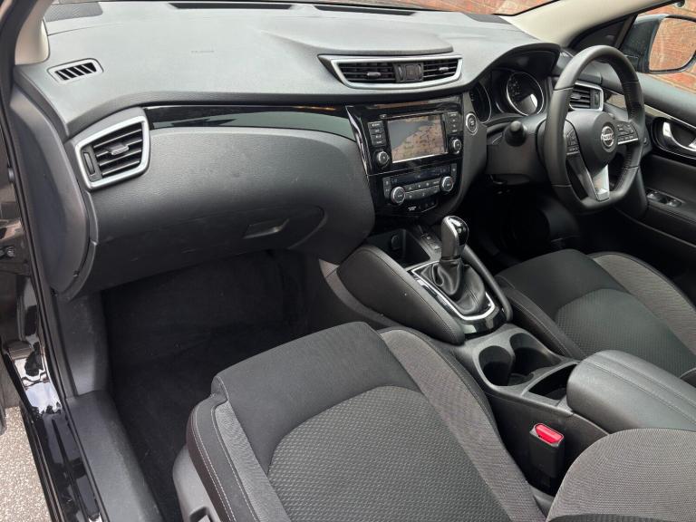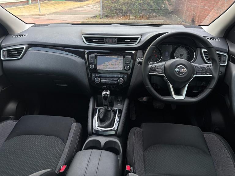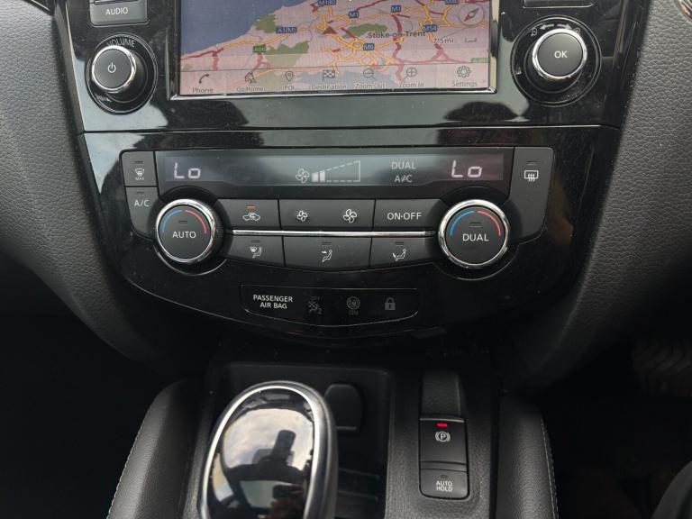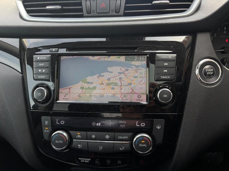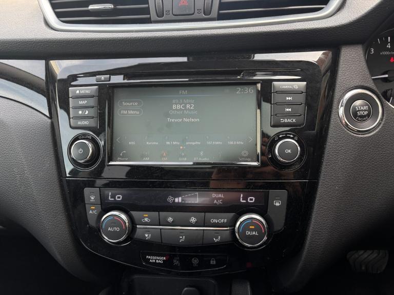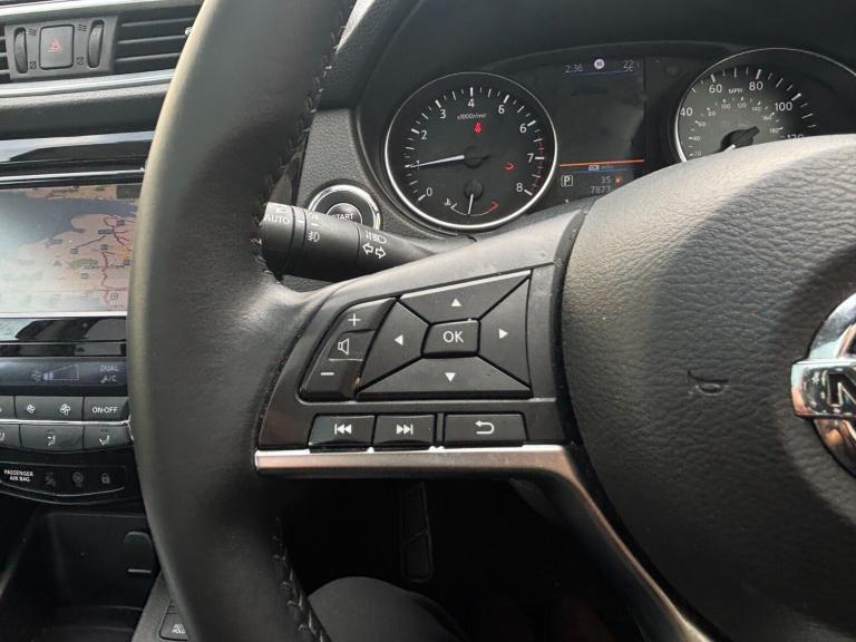 ..Advanced drive assist display 5'' TFT coloured screen, Android Auto, Apple CarPlay preparation, Bluetooth connectivity, Electric speed sensitive power steering, Front parking sensors, Intelligent around view monitor, Intelligent parking assist, Lane departure warning system, Nissan connect evo 7'' touchscreen navigation and entertainment system, Normal or sport selectable steering, Outside temperature sensor, Push button starter, Rear parking sensors, Rear view camera, Service interval indicator, Smartphone integration, Stop/start system, Tomtom connected services, Traffic sign recognition, Trip computer, Voice control system, Nissan chassis control (intelligent ride control, intelligent trace control, intelligent engine brake), 6 speakers, AM/FM radio, CD audio system, Aux-in socket, DAB Digital radio, Rear USB connection, Steering wheel mounted audio controls, USB port, Anti dazzle rear view mirror, Auto wipers, Body colour bumpers, Body coloured door handles, Body coloured door mirrors, Chrome window surround, Daytime running lights dip function when turn signal applied, Electric folding door mirrors, Electric front and rear windows with one touch illuminated window controls, Electric front/rear windows, Electrically adjustable door mirrors, Front fog lights, Halogen headlights, Heated door mirrors, High beam assist, Intelligent auto headlights, LED indicators in door mirrors, Matt silver roof rails, One touch 4x auto windows with illuminated switches, Privacy glass, Rear roof spoiler, Rear wiper with reverse link, Shark fin antenna, Signature LED daytime running lights, Underbody vortex generators, 2 X front 12v power sockets, 3 height adjustable rear headrests, 60/40 split folding rear seat, Ambient lighting, Ambient lighting in centre console, Boot lighting, Centre console storage box/armrest, Chrome interior door handles, Cloth upholstery, Configurable luggage board system, Driver's seat manual height adjust, Dual zone climate control, Front and rear door pockets with bottle holders, Front and rear seat belt pre-tensioners with load limiters, Height adjustable front headrests, ISOFIX restraints on outer rear seats x2, Leather D shaped steering wheel, Leather gear lever, Leather knee pad, Manual height adjustable front passenger seat, Manual lumbar support on driver seat, Parcel shelf stow function under luggage board, Pollen filter, Rear armrest with 2 cupholders, Synthetic leather wrapped door handle with contrasting stitching, Tilt/telescopic